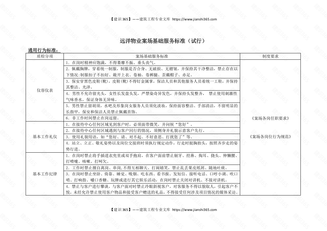 【建识365】--建筑工程专业文库https:/ww.jianshi365.com远洋物业案场基础服务标准(试行)通用行为标准:质检分项案场基础服务标准制度要求1.在岗时精神应饱满,不得萎靡不振、垂头丧气。2.佩戴胸牌,穿着统一制服,制服是否合身、无破损、无褶皱,并保持其干净整洁,禁止存在以下情况:制服扣子不扣好、敞开上衣、卷袖、卷裤腿、歪戴帽子、赤足。3.保安穿黑色皮鞋(靴),皮鞋(靴)不得钉金属学,保洁人员和其他服务人员着统一工鞋,并保持其整洁、光泽。仪容仪表4.男性不允许留光头,女性长发盘头发,严禁染奇异发色,并保持头发整齐,禁止使用刺激性气味香水,保证身体无异味。5,男性禁止留胡须,水吧及形象岗女服务人员须化淡妆,保持面容整洁、手部清洁,不留明显的长指甲,保安和保洁人员禁止佩戴首饰。6.非工作时间禁止在岗逗留。《案场各岗任职要求》1,在接待中心任何区域见到客户时,必须面带微笑,并问候“您好”。2.在接待中心任何区域遇到与客户同行的情况,须侧身并礼貌示意客户先行。基本工作礼仪3.使用礼貌用语,如“您好、请、对不起、不好意思、打扰您了”等。《案场各岗位行为规范》4.站立、立正、敬礼姿势以及岗位交接班时须执行规定动作,行走时挺胸抬头,按照齐步走的姿势行进。1.在岗时禁止将手插进衣兜里或双手抱肩,在客户面前禁止剔牙、挖鼻、掏耳、挠头、伸懒腰、打喷嚏、咳嗽、打呵欠。2.工作时禁止擅自离岗、串岗,不得互相聊天、打闹嬉笑,禁止乱丢果皮纸屑、随地吐痰。基本工作纪律3.在岗时禁止坐卧、倚靠、睡觉、吸烟、吃东西、看书报、发短信、接听电话、口哼小调、吹口哨、打响指、嚼口香糖、玩牌或进行其它娱乐活动,在岗时禁止关闭对讲机、不接对讲机。4.禁止与客户进行攀谈,与客户面对时禁止冷眼斜视客户,对客服务不得以貌取人,引起客户不悦,未经允许禁止使用客户物品和接受客户赠送的礼品,不得接受任何涉及项目情况的媒体采访。【建识365】一一建筑工程专业文库https:/www..jianshi3365.com【建识365】-一建筑工程专业文库https:/www.jianshi365.com5.禁止浪费材料、水、电等,不得偷吃(拿)接待中心食品、饮料,不得将接待中心物品拿回宿舍。6.对营销中心内部的机密事项,禁止随意打听、记录、传播,遵守营销中心的各项规章制度,服从领导的工作安排。7.遇到突发情况及时上报,面对客户的极端行为保持克制,做到“骂不还口、打不还手”8.禁止随意进入接待中心办公区及吧台,未经允许不得使用吧台设备及办公设施(如电脑、电话、传真机、复印机等),未经允许不得在样本间和接待大厅留宿。9.发现客户遗落物品,立即上前礼貌提醒并归还,不得私自留存、隐瞒。10.每日提前做好各项班前准备工作,各班工作做到有记录,交接班签字确认。1.每日召开班前或班后会议,主要总结前一天或当天各岗的工作情况,并及时纠正问题。2.各岗服务人员须了解项目的基本情况,如项目位置、周边环境、开发和物业公司名称等。3.每月至少23次以上组织培训所有员工,包括岗位技能、工作标准、配合开发工作事项等,人员能力及培训并留存相关培训记录。4.对所有案场服务人员的基本情况进行登记造册,包括外包服务人员。5.对各岗工作人员的每月工作时间须做出排班计划,并张贴在办公室、休息室及宿舍。案场保安:1.客户车辆驶入时,使用标准礼貌手势拦截,立正敬礼。2.如确认为看房客户,使用标准语言、手势指引客户停车3.客户泊好车后,主动走上前为客户打开车门,然后面带微笑说“您好”4.以标准手势为客户指接待大厅的方位,并配以引导性话语“请您从这条路前往接待大厅”。《停车场岗位工作流程和工作停车场岗位5.待客户离开时,主动引导客户驶出停车位,并立正敬礼,微笑道别“您慢走,欢迎再次光临”标准》且目送客户车辆离开。6.夏季为客户车辆挂置遮阳板,客户即将离开时主动上前拿下遮阳板。7.遇到雨雪天气,是否主动为客户撑伞,并将客户送至(送离)接待中心大厅。8.遇到客户携带重物,主动上前询问“您好,请问您需要帮忙吗”,在征得客户同意后,认真提【建识365】一一建筑工程专业文库https:/www..jianshi3365.com