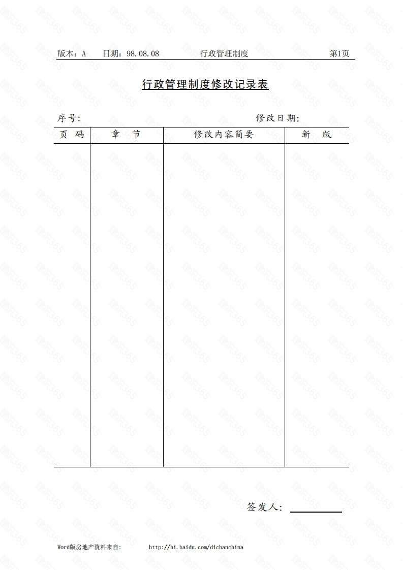 版本:A日期:98.08.08行政管理制度第1页行政管理制度修改记录表识365序号:修改日期:页码章节修改内容简要新版签发人:Word版房地产资料来自:http://hi.baidu.com/dichanchina版本:A日期:98.08.08行政管理制度第2页索2、范围.…33、参考资料.34、定义.5、行政管理:5.1公司资质管理..5.2公文管理...5.2.a保密管理规定.75.3印章管理....5.4会议制度及会议管理...105.6监理部管理...5.7通讯设备管理.5.8复印机管理...195.9办公用品管理..205.10机动车管理及调度..5.11.235.12单身员工住房管理.5.13256、附件.附件一.27附件二拟稿纸.28附件三收文处理专用纸…297、附表PM01-01传呼机申请表.…30PM01-02监理部耐用品登记表.PM01-03车辆维修申请表..PM01-04购买自行车申请表.33PM01-O5家属探亲申请表.Word版房地产资料来自:http://hi.baidu.com/dichanchina