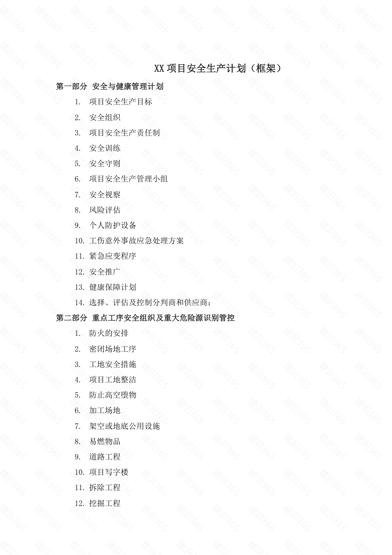 X项目安全生产计划(框架)第一部分安全与健康管理计划1.项目安全生产目标2.安全组织3.项目安全生产责任制4.安全训练5.安全守则6.项目安全生产管理小组7.安全视察8.风险评估9.个人防护设备10.工伤意外事故应急处理方案11.紧急应变程序12.安全推广识36513.健康保障计划14.选择、评估及控制分判商和供应商:第二部分重点工序安全组织及重大危险源识别管控1.防火的安排2.密闭场地工序识365识365识363.工地安全措施4.项目工地整洁识365只3655.防止高空堕物6.加工场地7.架空或地底公用设施8.易燃物品9.道路工程10.项目写字楼11.拆除工程12.挖掘工程13.吊运程序14.机械、人力搬运材料15.临时结构支撑16.钢结构工程识365识36517.焊接工程18.工地交通建识36519.爆破工序20.打桩工程21.隧道工程识365识365识3622.压力容器23.电气工序识365识365识36524.机械设备25.木工机械识36识36526.房屋维修保养工作27.危险物品的储藏、运输28.工地宿舍安全细则识365建识365识365识365建识365建识365识365建识365建识36识36建识36建识36