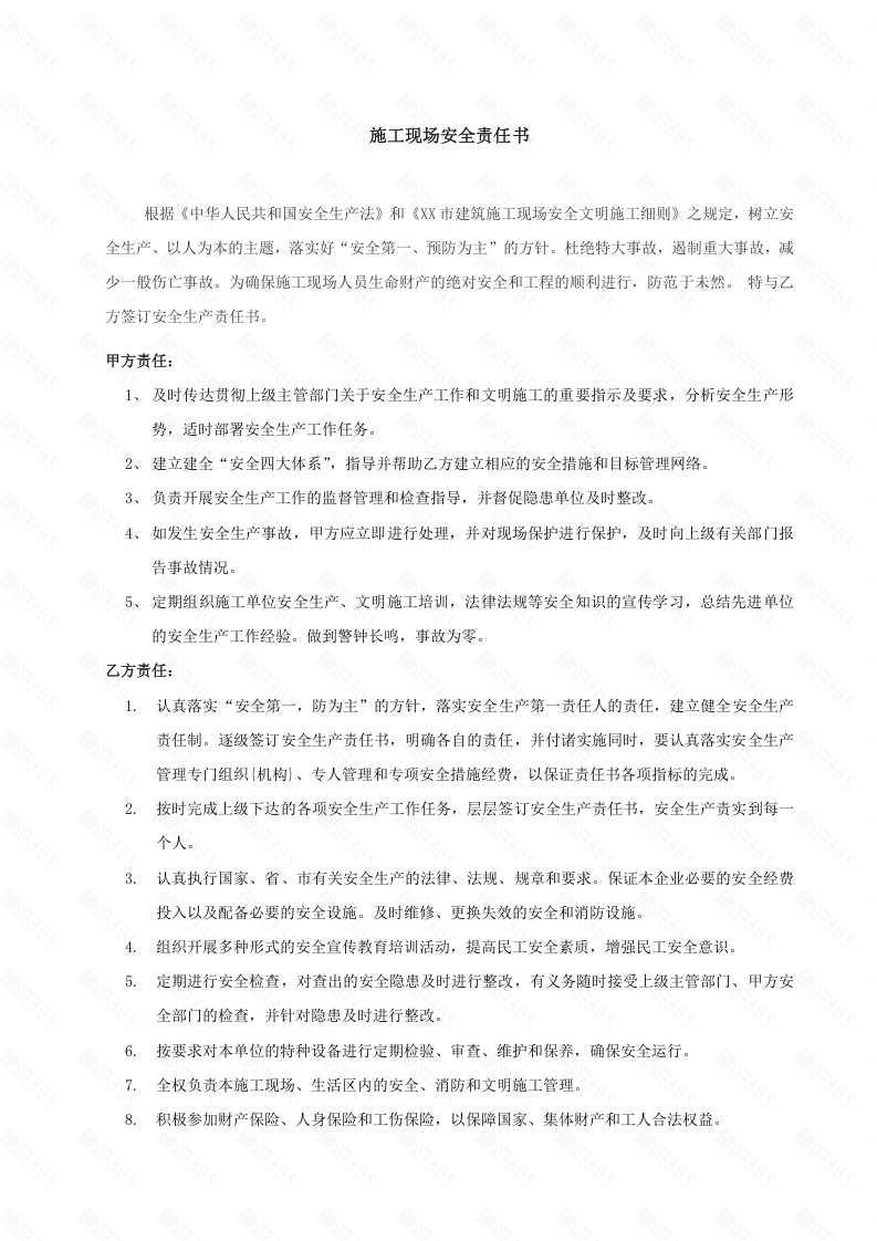 施工现场安全责任书根据《中华人民共和国安全生产法》和《XX市建筑施工现场安全文明施工细则》之规定,树立安全生产、以人为本的主题,落实好“安全第一、预防为主”的方针。杜绝特大事故,遏制重大事故,减少一般伤亡事故。为确保施工现场人员生命财产的绝对安全和工程的顺利进行,防范于未然。特与乙方签订安全生产责任书。甲方责任:1、及时传达贯彻上级主管部门关于安全生产工作和文明施工的重要指示及要求,分析安全生产形势,适时部署安全生产工作任务。2、建立建全“安全四大体系”,指导并帮助乙方建立相应的安全措施和目标管理网络。3、负责开展安全生产工作的监督管理和检查指导,并督促隐患单位及时整改。4、如发生安全生产事故,甲方应立即进行处理,并对现场保护进行保护,及时向上级有关部门报告事故情况。5、定期组织施工单位安全生产、文明施工培训,法律法规等安全知识的宣传学习,总结先进单位的安全生产工作经验。做到警钟长鸣,事故为零。乙方责任:1.认真落实“安全第一,防为主”的方针,落实安全生产第一责任人的责任,建立健全安全生产责任制。逐级签订安全生产责任书,明确各自的责任,并付诸实施同时,要认真落实安全生产管理专门组织{机构}、专人管理和专项安全措施经费,以保证责任书各项指标的完成。2.按时完成上级下达的各项安全生产工作任务,层层签订安全生产责任书,安全生产责实到每一个人3.认真执行国家、省、市有关安全生产的法律、法规、规章和要求。保证本企业必要的安全经费投入以及配备必要的安全设施。及时维修、更换失效的安全和消防设施。4.组织开展多种形式的安全宣传教育培训活动,提高民工安全素质,增强民工安全意识。5.定期进行安全检查,对查出的安全隐患及时进行整改,有义务随时接受上级主管部门、甲方安全部门的检查,并针对隐患及时进行整改。6.按要求对本单位的特种设备进行定期检验、审查、维护和保养,确保安全运行。7.全权负责本施工现场、生活区内的安全、消防和文明施工管理。8.积极参加财产保险、人身保险和工伤保险,以保障国家、集体财产和工人合法权益。9.总结推广本单位安全生产先进经验和典型,表扬好人好事,奖励有功人员。10.积极参加甲方安全生产会议和培训。11.各项指标完成情况以书面形式向甲方进行全面的报告。12.如发生安全事故,乙方必须第一时间向甲方报告,并及时进行处理。本责任书自签订之日起生效。识36甲方单位:乙方单位:甲方责任人(签字)乙方责任人(签字)二0XX年月日二0XX年月识365识36识36识365识365识365识365建识365建识365识36建识365识365建识365建识36识365只365只365识365只365建识365