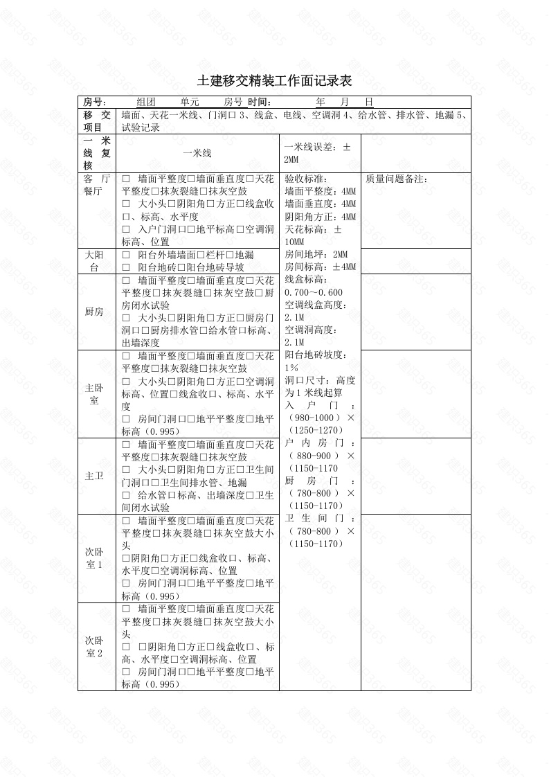 土建移交精装工作面记录表房号:组团单元房号时间:年月日移交墙面、天花一米线、门洞口3、线盒、电线、空调洞4、给水管、排水管、地漏5、项目试验记录米线复米线米线误差:±核客厅口墙面平整度口培面垂直度口天花验收标准:质量问题备注:餐厅平整度口抹灰裂缝口抹灰空鼓墙面平整度:4M口大小头口阴阳角口方正口线盒收墙面垂直度:4M口、标高、水平度阴阳角方正:4M口入户门洞口口地平标高口空调洞天花标高:士标高、位置大阳阳台外墙墙面口栏杆口地漏房间地坪:2M台阳台地砖口阳台地砖导坡房间标高:±4M口墙面平整度口培面垂直度口天花线盒标高:平整度口抹灰裂缝口抹灰空鼓口厨0.700-0.600厨房房闭水试验空调线盒高度:口大小头口阴阳角口方正口厨房门2.1M洞口口厨房排水管口给水管口标高、空调洞高度:出墙深度2.1M口墙面平整度口墙面垂直度口天花阳台地砖坡度:平整度口抹灰裂缝口抹灰空鼓1%主卧口大小头口阴阳角口方正口空调洞洞口尺寸:高度标高、位置口线盒收口、标高、水平为1米线起算室度入户门口房间门洞口口地平平整度口地平(980-1000)×标高(0.995)(1250-1270)口墙面平整度口墙面垂直度口天花户内房门:平整度口抹灰裂缝口抹灰空鼓(880-900)×主卫口大小头口阴阳角口方正口卫生间(1150-1170门洞口口卫生间排水管、地漏厨房门口给水管口标高、出墙深度口卫生(780-800)×间闭水试验(1150-1170)口墙面平整度口墙面垂直度口天花卫生间门:平整度口抹灰裂缝口抹灰空鼓大小(780-800)×次卧头(1150-1170)室1口阴阳角口方正口线盒收口、标高、水平度口空调洞标高、位置口房间门洞口口地平平整度口地平标高(0.995)▣墙面平整度口墙面垂直度▣天花平整度口抹灰裂缝口抹灰空鼓大小次卧头室2口阴阳角口方正口线盒收口、标高、水平度口空调洞标高、位置房间门洞口口地平平整度口地平标高(0.995)口墙面平整度口墙面垂直度口天花平整度口抹灰裂缝口抹灰空鼓口大小头口阴阳角口方正口空调洞书房标高、位置口线盒收口、标高、水平度口房间门洞口口地平平整度口地平标高▣墙面平整度▣天花平整度▣抹灰裂缝口抹灰空鼓公口大小头口阴阳角口方正口卫生间卫门洞口口卫生间排水管、地漏口给水管口标高、出墙深度口卫生间闭水试验工作口阳台外墙墙面口栏杆口地漏口阳阳台台地砖导坡口阳台地砖给水管试压记录:排水管、」地漏闭水、灌水记录:线盒电线检测记录土建承包商意见:监理公司意见:检查情况/土建承包商整改完成情况结论:会签装修承包商:时间监理公司:时间土建承包商:时间业主工程师:时间识365识365识365识365