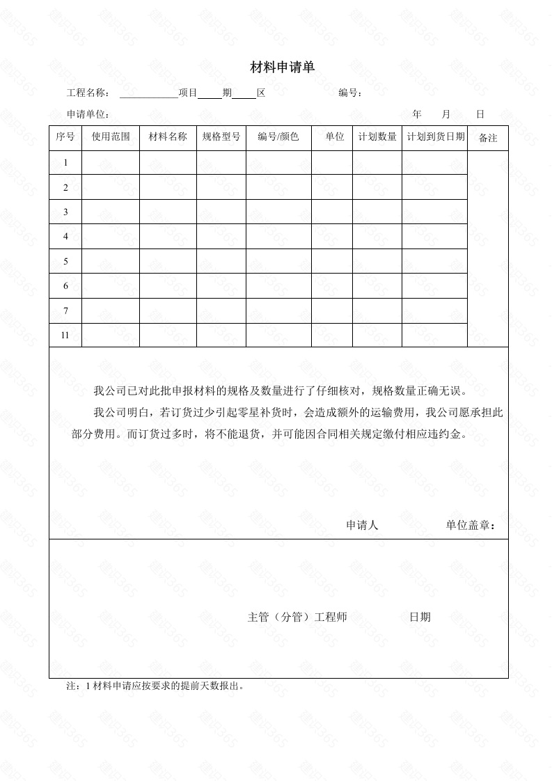 材料申请单工程名称:项目期区编号:申请单位:年月日序号使用范围材料名称规格型号编号颜色单位计划数量计划到货日期备注1246>11我公司已对此批申报材料的规格及数量进行了仔细核对,规格数量正确无误。我公司明白,若订货过少引起零星补货时,会造成额外的运输费用,我公司愿承担此部分费用。而订货过多时,将不能退货,并可能因合同相关规定缴付相应违约金。申请人单位盖章:主管(分管)工程师日期识36注:1材料申请应按要求的提前天数报出。