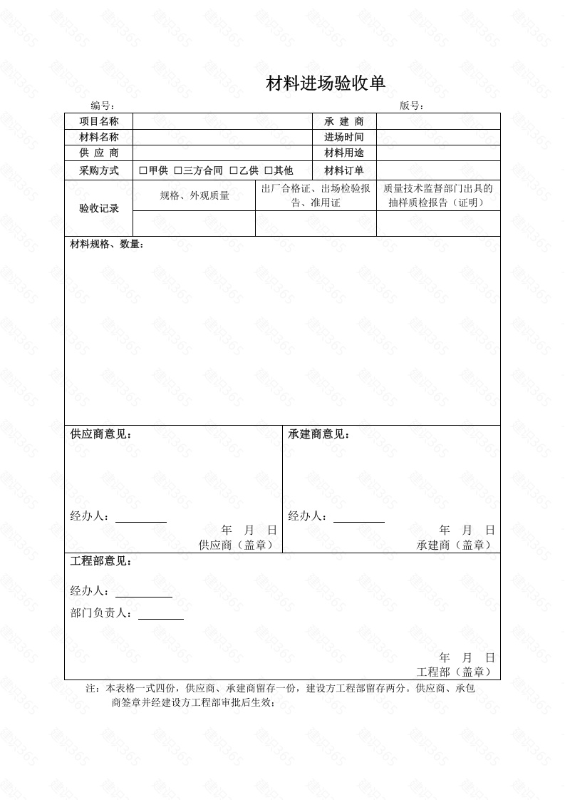 材料进场验收单编号:版号:项目名称承建商材料名称进场时间供应商材料用途采购方式口甲供口三方合同口乙供口其他材料订单规格、外观质量出厂合格证、出场检验报质量技术监督部门出具的验收记录告、准用证抽样质检报告(证明)材料规格、数量:供应商意见:承建商意见:经办人:经办人:年月日年月日供应商(盖章)承建商(盖章)工程部意见:经办人:部门负责人:年月日工程部(盖章)注:本表格一式四份,供应商、承建商留存一份,建设方工程部留存两分。供应商、承包商签章并经建设方工程部审批后生效: