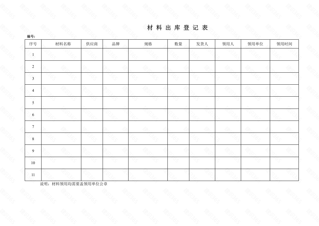 材料出库登记表编号:序号材料名称供应商品牌规格数量发货人领用人领用单位领用时间2346>91011说明:材料领用均需要盖领用单位公章