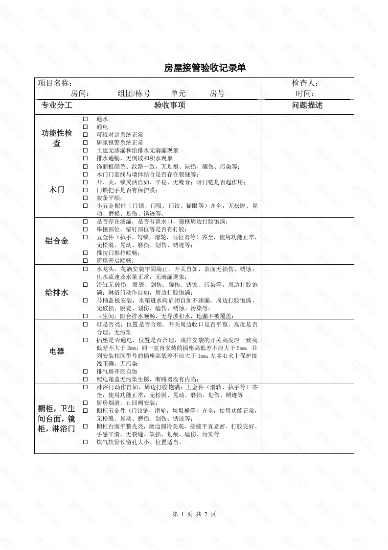 房屋接管验收记录单项目名称:检查人:房间:组团栋号单元房号时间:专业分工验收事项问题描述通水通电功能性检可视对讲系统正常查居家报警系统正常土建无渗漏和给排水无滴漏现象排水通畅、无倒坡和积水现象饰面板颜色、纹路一致,无划痕、缺损、磕伤、污染等:木门门套线与墙体结合是否存在裂缝等:开、关、锁灵活自如、平稳、无噪音:暗门链是否起作用:木门门锁把手是否有保护膜:胶条平顺:小五金配件(门锁、门吸、门铰、猫眼等)齐全,无松脱、晃动、磨损、划伤、锈迹等:是否存在渗漏,是否有泄水口,窗框周边打胶饱满:华接部位,锚钉部位等是否有打胶:铝合金五金件(执手,勾锁,滑轮,限位器等)齐全,使用功能正常,无松脱、晃动、磨损、划伤、锈迹等:推拉门推拉顺畅:窗扇开启顺畅:水龙头,花酒安装牢固端正、开关自如,表面无损伤、锈蚀:出水流速及水量正常,无滴漏现象:浴缸无破损、脱瓷、划伤、磕伤、锈蚀、污染等,周边打胶饱给排水满:淋浴门动作自如,周边打胶饱满:马桶盖板安装,水箱进水阀启闭自如不渗漏,周边打胶饱满,无破损、脱瓷、划伤、磕伤、锈蚀、污染等:卫生间,阳台排水顺畅,无导坡积水,地漏不被覆盖:灯是否亮,位置是否合理,开关周边收口是否平整,高度是否合理,无污染插座是否通电,位置是否合理,成排安装的开关高度应一致高电器低差不大于2m:同一室内安装的插座高低差不应大于5mm:并列安装相同型号的插座高低差不应大于1m:左零右火上保护接线正确,无污染排气扇开闭自如配电箱盖无污染生锈,断路器没有内陷:▣淋浴门动作自如,周边打胶饱满:五金件(滑轨,执手等)齐全,使用功能正常,无松脱、晃动、磨损、划伤、锈迹等厨房烟道,止回阀安装:橱柜,卫生橱柜五金件(门铰链,滑轮,垃圾桶等)齐全,使用功能正常,间台面,镜无松脱、晃动、磨损、划伤、锈迹等:柜,淋浴门橱柜台面平整光亮,磨边圆滑美观,接缝平直紧密、打胶完好、手感平滑,无裂缝、缺损、划痕、磕伤、污染等煤气软管预留孔大小、位置适当。第1页共2页栏杆高度1.10米:木扶手安装牢固,无开裂、无缺损、划伤、周定件完好、拼角栏杆,扶顺平:手,空调铁件是否有生锈,变形,断开等:洞,层高◇空调洞位置是否合理,有无排水立管遮挡空调洞现象,前后空调洞是否前高后低:测量具体层高数据:墙地砖没有空鼓、缺棱掉角等:墙地砖墙地砖没有过大翘曲、色差、大小头等:墙地砖接缝顺直,接缝填嵌密实、平直、宽窄一致:墙身天花油漆验收一致,无色差,无透底,无漏刷,无流坠,无污染等天花墙身墙身天花无裂缝:阴阳角顺直方正:涂料吊顶整体完好、安装牢固,表面平整、颜色均匀,线角顺直方正,与梁底接缝无开裂:无污染,划痕,崩角等。无大小头。色泽同一性木地板预留置伸缩,不允许木板起伏。接缝、钉口要按规范处理。拼缝密实。成品保护到位。踏步砖没有空鼓、缺棱掉角等:墙身无裂缝,阴阳角顺直方正,滴水线清晰:栏杆木扶手安装牢固,无开裂、无缺损、划伤、周定件完好、阳台等公拼角顺平:共部分栏杆铁件是否有生锈,变形,断开等:窗开启自如:首层杂物间隔栅:阳台水管后墙面面油漆平整,水管无污染热水器和强电插座、煤气表等位置合理识365识365第2页共2页