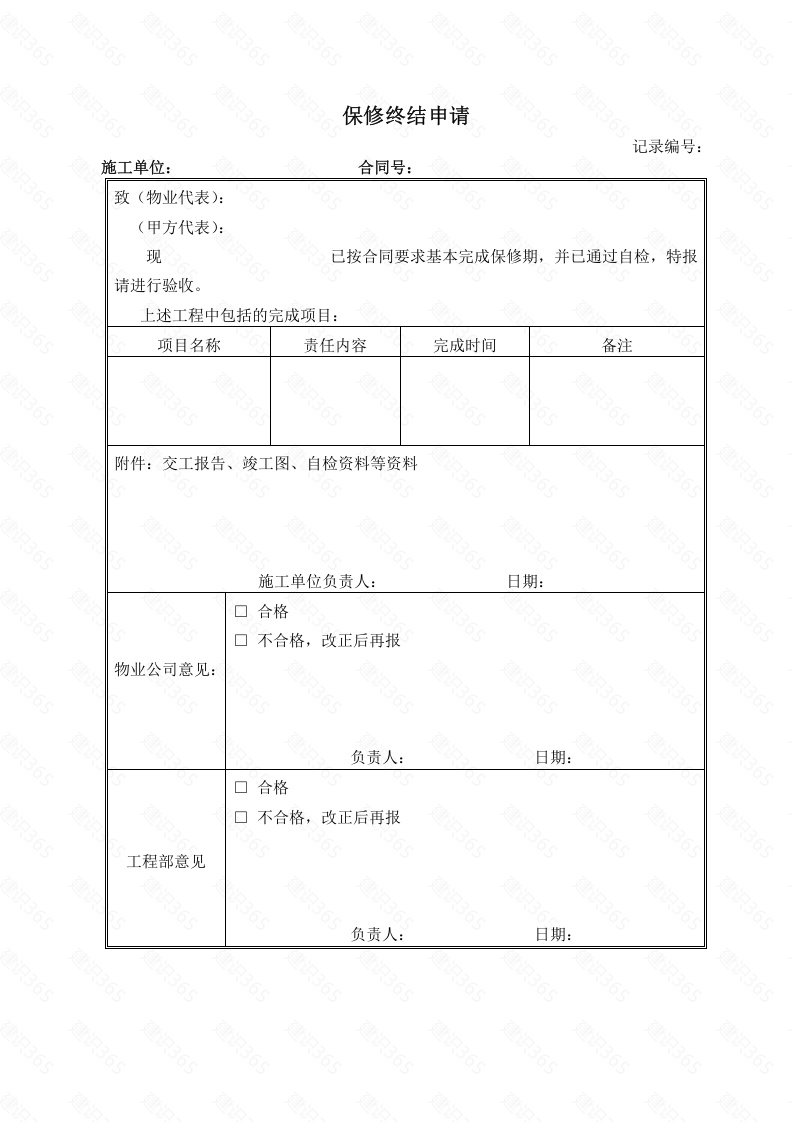 保修终结申请记录编号:施工单位:合同号:致(物业代表):(甲方代表):现已按合同要求基本完成保修期,并已通过自检,特报请进行验收。上述工程中包括的完成项目:项目名称责任内容完成时间备注附件:交工报告、竣工图、自检资料等资料施工单位负责人:日期:口合格口不合格,改正后再报物业公司意见:识365负责人:日期:口合格口不合格,改正后再报工程部意见负责人:日期: