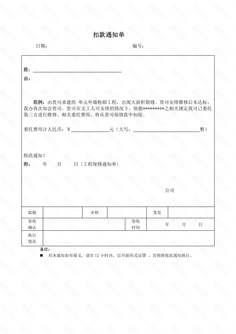 扣款通知单日期:编号:致:由:范例:由贵司承建的单元外墙粉刷工程,出现大面积裂缝。贵司安排维修后未达标,我办再次知会贵司,贵司在无工人可安排的情况下,依据***之相关规定我司已委托第三方进行维修。相关委托费用,将从贵司保修款中扣除。委托费用计人民币:¥元(大写:整)特此通知!附:日〈工程保修通知单)只365只365只365公司拟稿审核签发签收签收年月确认时间日执行情况备注:■对本通知如有疑义,请在12小时内,以书面形式反馈,否则将按此通知执行。