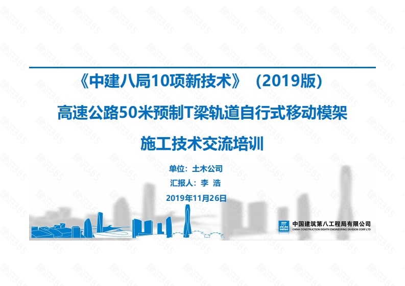 《中建八局10项新技术》(2019版)高速公路50米预制T梁轨道自行式移动模架施工技术交流培训单位:土木公司汇报人:李浩2019年11月26日中国建筑第八工程局有限公司第一部分技术内容简介第二部分工艺流程及操作要点目录第三部分技术指标CONTENTS第四部分适用范围第五部分应用效果分析及推广前景