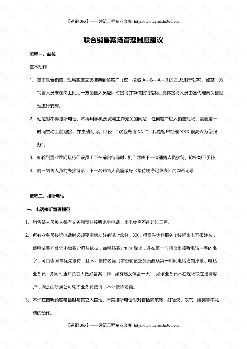 【建识365】一建筑工程专业文库https:www,jianshi365.com联合销售案场管理制度建议流程一、站位基本动作1、基于联合销售,现场实施交叉接待到访客户(统一按照A一B一A一B的方式进行轮序),如某一方销售人员未在岗上则另一方销售人员应即时接待并算做接待指标。具体接待人员由各代理商销售经理进行安排。2、站位时不得接听电话,不得用手机浏览与工作无关的网站;任何客户进入销售现场,需要第一时间主动上前迎接,并主动询问。口径:“欢迎光临XX”,我是客户经理XXX,很高兴为您服务”。3、如轮到置业顾问接待但该员工不在前台待岗时,则自然由下一位销售人员接待,轮空均不予补:4、前一销售人员前去接待后,下一名销售人员需做好《接待轮序记录表》的勾画记录。流程二、接听电话电话接听管理规范1、销售部人员每人都有义务和责任接听来电电话,来电铃声不能超过三声。2、所有业务员接听电话时必须要亲切友好的说:“您好,XX,很高兴为您服务接听来电可报姓名,但电话客户登记不做客户归属依据,如电话客户到访现场,并在第一时间报出接听电话同事的名字,可由该同事优先接待,且不计接待名额(前台轮值业务员必须第一时间电话通知原接听电话业务员,并同时通知负责人做好备案工作,如有违反停盘一天),如该业务员不在现场或在接待客户,则是由所属公司轮序业务员接待,不计接待名额。3、不许在接听顾客电话时与其它人搭话,严禁接听电话时对着话简咳嗽、打哈欠、叹气、嬉笑等不礼貌的动作。【建识365】一建筑工程专业文库https:fww,jianshi365.com【建识365】一建筑工程专业文库https:/www.jianshi365.com4、当客户所找的业务员不在现场时,应很客气的询问对方有何事,可否代为传话,或者记录下来转告被找的同事。叫同事接听电话时,不许远距离大声喊叫,而应走到被找人身边去说,放话筒时动作要轻缓。二、客户登记管理规范1、来访客户的登记必须按照《客户来访登记表》要求填写,内容包括有效联系电话及全名、获知信息渠道等,内容详细真实以《客户来访登记表》内之客户第一次登记为准,销售人员有责任跟进已登记并属其跟进之客户,促成交易。2、电话咨询客户或客户未亲自前来一律不准在《来访客户登记本》上做登记;只能在来电客户登记本上记录。3、销售人员应邀请客户填写《客户来访登记表》,如客户不愿填写,销售人员应在客户离开后根据自己了解的情况填写《客户来访登记表》。4、各公司销售人员按照客户接待轮序本进行轮序查看,确认接待顺序。该接待顺序必须得到三方一致认可。三、销售中心到访客户接待的管理规范:一旦产生客户归属纠纷,不得在案场当着客户的面争单,主动争单的一方视为放弃该客户,并承担争单之全部责任;所产生的客户纠纷,在不影响案场销售秩序的情况下,两方销售经理和开发商销售负责人员按照案场管理规范协商解决。1、销售中心到访客户接待以销售人员第一时间站至轮排前台为准,分为1号和2号同时站在销售台等待客户,等候客人到访过程中,若1号销售人员离开接待台无任何理由,一律由站至轮排前台处的2号销售人员站至1号位置等候、接待到访客户,则原1号位置销售人员被跳过,不【建识365】一建筑工程专业文库https:wvw,jianshi365.com