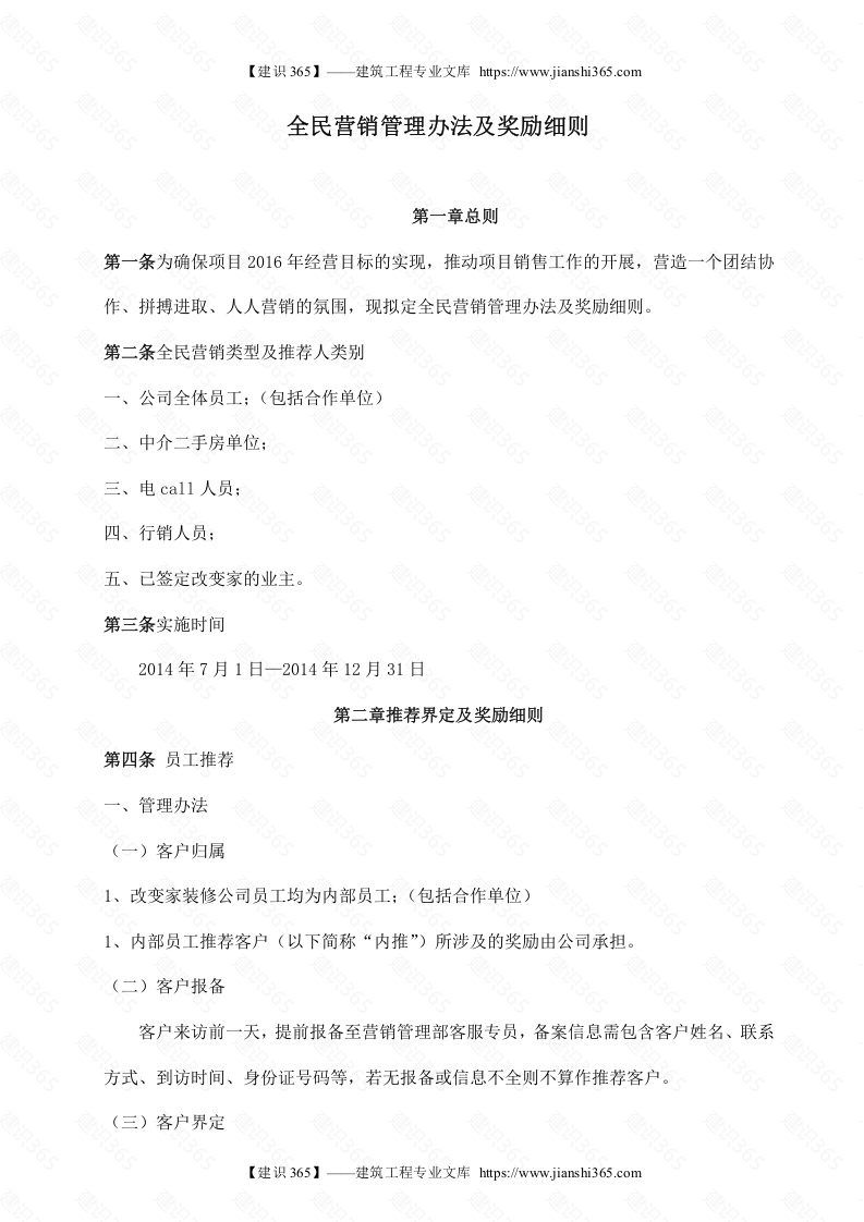 【建识365】一建筑工程专业文库htps:www.jianshi365.com全民营销管理办法及奖励细则第一章总则第一条为确保项目2016年经营目标的实现,推动项目销售工作的开展,营造一个团结协作、拼搏进取、人人营销的氛围,现拟定全民营销管理办法及奖励细则。第二条全民营销类型及推荐人类别一、公司全体员工:(包括合作单位)二、中介二手房单位:三、电cal1人员:四、行销人员:五、已签定改变家的业主。第三条实施时间2014年7月1日-2014年12月31日第二章推荐界定及奖励细则第四条员工推荐一、管理办法(一)客户归属1、改变家装修公司员工均为内部员工:(包括合作单位)1、内部员工推荐客户(以下简称“内推”)所涉及的奖励由公司承担。(二)客户报备客户来访前一天,提前报备至营销管理部客服专员,备案信息需包含客户姓名、联系方式、到访时间、身份证号码等,若无报备或信息不全则不算作推荐客户。(三)客户界定【建识365】一建筑工程专业文库htps:www,jianshi365.com【建识365】一建筑工程专业文库htps:www,jianshi365.com1、员工推荐客户必须为从未到访的新客户,已登记来电或来访的客户不算作推荐客户:2、若推荐人所推荐之客户1个月内仍未成交的,则不视为推荐客户:3、员工推荐与其他渠道推荐同时发生的,以首个报备的实际客户信息为准。(四)客户邀约1、客服专员每日将已完成界定的客户信息做好汇总和登记后,移交至销售经理:2、销售经理分配至家装顾问对客户进行电访及邀约。(五)客户接待客户到访后,推荐人在客服专员处登记,然后由销售经理分配的家庭顾问进行接待:(六)推荐流程推荐人提供项目信息和产品信息给被推荐人,家庭顾问联系被推荐人→被推荐人选购物业→推荐人督促被推荐人下单,缴纳所需各项款项→推荐人在家装顾问的配合下填写销售和财务所需手续→被推荐人全款或者分期放款到达公司账户后,经财务核实,发放推荐奖励。(七个工作日后发放)(七)成交业绩1、内推客户属于公司资源,不纳入团队考核及PK的范畴:2、新客户在员工的陪同下首次到访的,经查询备案属实的,根据备案记录转由家装顾问进行接待:3、新客户首次到访无员工陪同的,家装顾问对客户进行询问并查询是否为备案客户,确认后转由指定置业顾问进行接待:4、员工推荐客户成交后的争议必须于客户认购之日起七日内提出,逾期提出争议无效,不再受理。二、奖励细则(一)家装部分【建识365】一建筑工程专业文库https:www.jianshi3.65.com