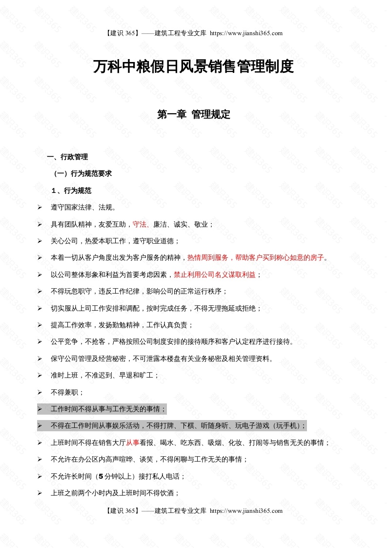 【建识365】一建筑工程专业文库https:fwww,jianshi365.com万科中粮假日风景销售管理制度第一章管理规定一、行政管理(一)行为规范要求1、行为规范>遵守国家法律、法规。>具有团队精神,友爱互助,守法、廉洁、诚实、敬业;>关心公司,热爱本职工作,遵守职业道德;>,本着一切从客户角度出发为客户服务的精神,热情周到服务,帮助客户买到称心如意的房子。>以公司整体形象和利益为首要考虑因素,禁止利用公司名义谋取利益;>不得玩忽职守,违反工作纪律,影响公司的正常运行秩序;切实服从上司工作安排和调配,按时完成任务,不得无理拖延或拒绝;>提高工作效率,发扬勤勉精神,工作认真负责;>公平竞争,不抢客,严格按照公司制度安排的接待顺序和客户认定程序进行接待。保守公司管理及经营秘密,不可泄露本楼盘有关业务秘密及相关管理资料。>准时上班,不准迟到、早退和旷工;不得兼职;工作时间不得从事与工作无关的事情;不得在工作时间从事娱乐活动,不得打牌、下棋、听随身听、玩电子游戏(玩手机);上班时间不得在销售大厅从事看报、喝水、吃东西、吸烟、化妆、打闹等与销售无关的事情;>不允许在办公区内高声喧哗、谈笑,不得闲聊与工作无关的事情;>不允许长时间(5分钟以上)接打私人电话;上班之前两个小时内及上班时间不得饮酒;【建识365】一建筑工程专业文库https://www.jianshi365.com【建识365】一建筑工程专业文库https:fwww,jianshi365.com>任何员工、任何时候不得在售楼处打架、骂人;员工在工作时间应坚守工作岗位;接待来访、业务洽谈等应在洽谈区进行;随时保持前台及洽谈桌椅的整洁,每位置业顾问在客户离开后应立即清理洽谈桌面并将椅子恢复原位,保持销售大厅整洁;下班前,应自觉清理前台及自己的办公桌,将所有文件尽数归档,并收存好自己的办公用品;桌面不得摆放与销售无关的物品;不得乱扔办公用品,经发现,以没收处理;2、仪容仪表2.1、男士上班时间统一着装,保持整洁大方,工号牌要佩带在左胸前,不能将衣袖、裤子卷起。系领带时,要将衣服下摆扎在裤里,穿黑皮鞋要保持光亮。仪容要大方,头发要常修剪,不留长发,发脚长度以保持不盖耳部和不触衣领为度,指甲要常修剪。>不得留胡须,要每天修脸,以无胡茬为合格。上班前不吃异味食品和不喝含酒精的饮料,注意个人清洁卫生。2.2、女士>上班时间统一着装,保持整洁大方,工号牌要佩带在左胸前,穿裙子不可露出袜口,应穿肉色袜子;>女士上班要淡妆打扮,要求粉底不能打得过厚,且要保持均匀,与其皮肤底色协调:眼影以不易被明显察觉为宜,眼线不要勾画太重,眼眉要描得自然,原则上以弥补眉形中的轻描为主不许纹眉或因勾描过重而产生纹眉效果;>涂胭脂以较淡和弥补脸型不足为基本标准,令人感受到青春的朝气和精神饱满;不留长指甲、不涂有色的指甲油,发式要按销售中心的规定要求,不留怪异发型,头发要梳洗整齐不披头散发。上班时间不准戴夸张的头饰和首饰,戴项链不外露,不准戴有色眼镜。每日上班前要检查自己的仪表,需整理仪表时,要到卫生间或工作间,不要当着客人的面或在公共场所整理。2.3、整体要求>工作时间必须着工装,保持整洁、大方,并佩带胸牌,体现良好的精神面貌;>每天都要刷牙漱口。上班前不得吃有异味的食物,要勤洗手、勤剪指甲,指甲边缝不得藏有赃物。在为客户服务时,不得流露出厌烦、冷漠、愤怒、紧张和恐惧的表情,要友好、热情、优雅和精神饱【建识365】一建筑工程专业文库https:/www,jianshi365.com