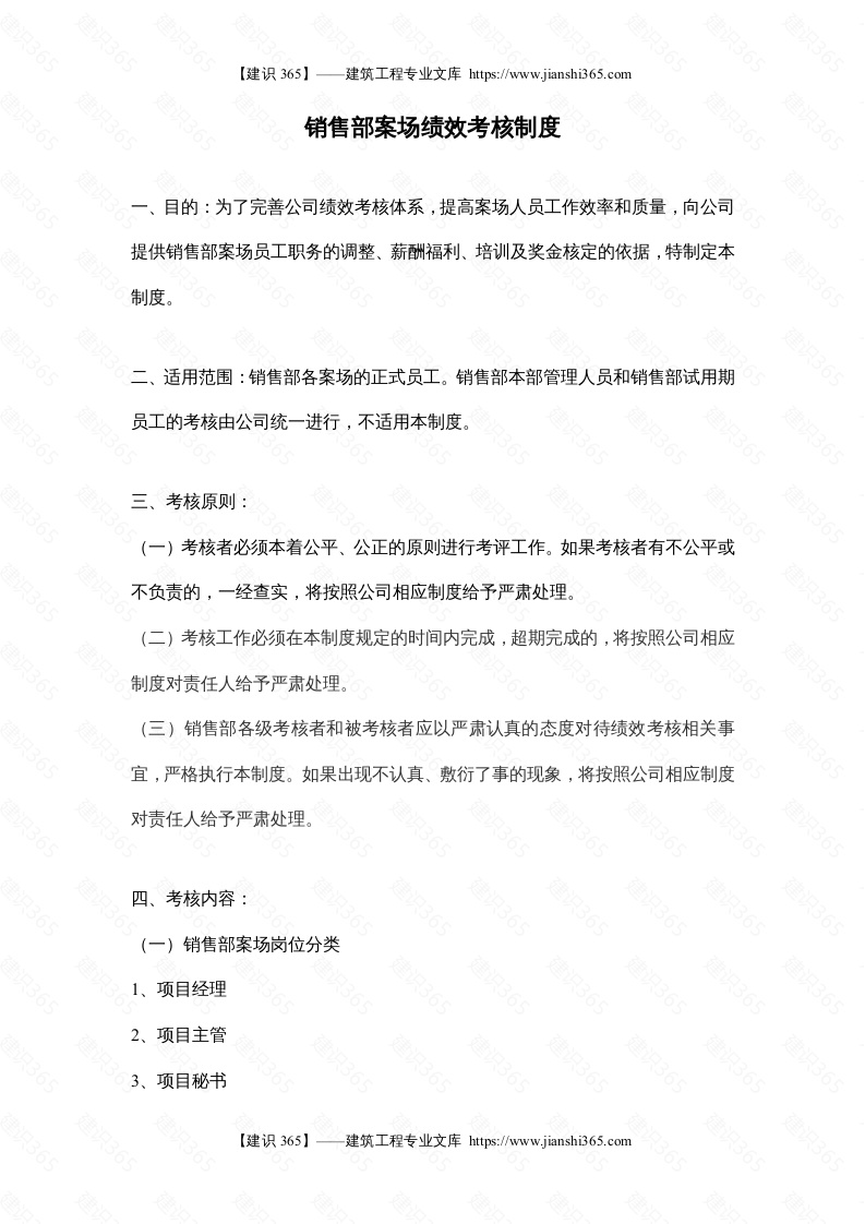 【建识365】一建筑工程专业文库https::/wvw,jianshi365.com销售部案场绩效考核制度一、目的:为了完善公司绩效考核体系,提高案场人员工作效率和质量,向公司提供销售部案场员工职务的调整、薪酬福利、培训及奖金核定的依据,特制定本制度。二、适用范围:销售部各案场的正式员工。销售部本部管理人员和销售部试用期员工的考核由公司统一进行,不适用本制度。三、考核原则:(一)考核者必须本着公平、公正的原则进行考评工作。如果考核者有不公平或不负责的,一经查实,将按照公司相应制度给予严肃处理。(二)考核工作必须在本制度规定的时间内完成,超期完成的,将按照公司相应制度对责任人给予严肃处理。(三)销售部各级考核者和被考核者应以严肃认真的态度对待绩效考核相关事宜,严格执行本制度。如果出现不认真、敷衍了事的现象,将按照公司相应制度对责任人给予严肃处理。四、考核内容:(一)销售部案场岗位分类1、项目经理2、项目主管3、项目秘书【建识365】一建筑工程专业文库htps:小vw,jianshi365.com【建识365】一建筑工程专业文库https::/www.jianshi365.com置业顾问:A级置业顾问、B级置业顾问、C级置业顾问(二)考核细则1、项目经理的考核(1)项目经理的考核以月为单位进行。(2)项目经理的考核由销售部经理负责。(3)项目经理的考核由业绩考核、日常工作考核、考勤、上级评价四大部分组成。其中业绩考核占50%比例;日常工作考核占45%比例;考勤占5%比例;上级评价占5%比例。(见附一《销售部项目经理绩效考核表》)2、项目主管的考核(1)项目主管的考核以月为单位进行。(2)项目主管的考核由项目经理负责。(3)项目主管的考核由业绩考核、日常工作考核、考勤、上级评价四大部分组成。其中业绩考核占60%比例;日常工作考核占35%比例;考勒占5%比例;上级评价占5%比例。(见附二《销售部项目主管绩效考核表》)3、项目秘书的考核(1)项目秘书的考核以月为单位进行。(2)项目秘书的考核由项目经理负责。(3)项目秘书的考核由日常工作考核、考勤、上级评价三大部分组成。其中日常工作考核占85%比例;考勤占5%比例;上级评价占10%比例。(见附三《销售部项目秘书绩效考核表》)4、置业顾问的考核(1)置业顾问的考核以月为单位进行。【建识365】一建筑工程专业文库https://www.jianshi365.com
