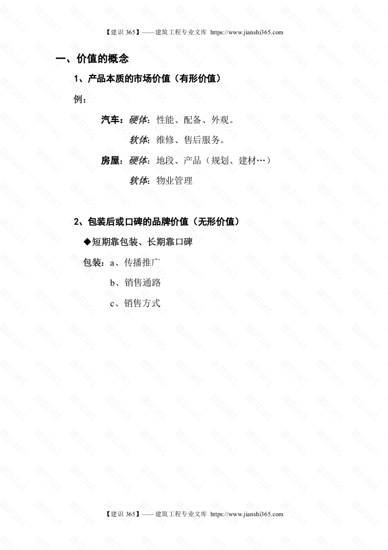 【建识365】一建筑工程专业文库https:/www,jianshi365.com一、价值的概念1、产品本质的市场价值(有形价值)例:汽车:硬体:性能、配备、外观。软体:维修、售后服务。房屋:硬体:地段、产品(规划、建材…)软体:物业管理2、包装后或口碑的品牌价值(无形价值)◆短期靠包装、长期靠口碑包装:a、传播推广识365b、销售通路c、销售方式【建识365】一建筑工程专业文库https:/www,jianshi365.com【建识365】一建筑工程专业文库htps:ww,jianshi365.com二、形象包装拉高姿态识365建识3651、世界顶尖的2、前所未有的3、无法想像的4、高不可攀的5、稀有限量的(有钱不见得买得到)6、光看,就己经是荣耀(参观的资格审查)7、你现在过得其实并不好识36识365识365识365识365识36只365【建识365】一建筑工程专业文库https:/www,jianshi365.com