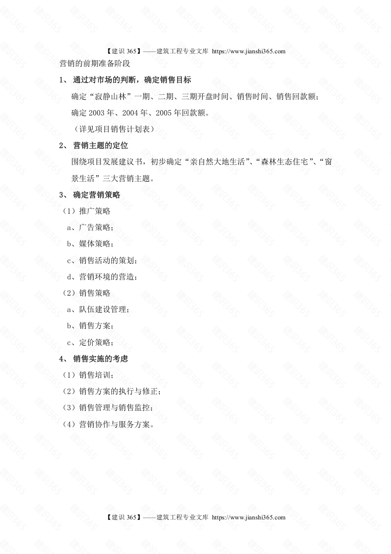 【建识365】一建筑工程专业文库https:fwww,jianshi365.com营销的前期准备阶段1、通过对市场的判断,确定销售目标确定“寂静山林”一期、二期、三期开盘时间、销售时间、销售回款额:确定2003年、2004年、2005年回款额。(详见项目销售计划表)2、营销主题的定位围绕项目发展建议书,初步确定“亲自然大地生活”、“森林生态住宅”、“窗景生活”三大营销主题。3、确定营销策略(1)推广策略a、广告策略:b、媒体策略:c、销售活动的策划:d、营销环境的营造:(2)销售策略a、队伍建设管理:b、销售方案:4、销售实施的考虑(1)销售培训:(2)销售方案的执行与修正:(3)销售管理与销售监控:(4)营销协作与服务方案。【建识365】一建筑工程专业文库https:/www.jianshi365.com