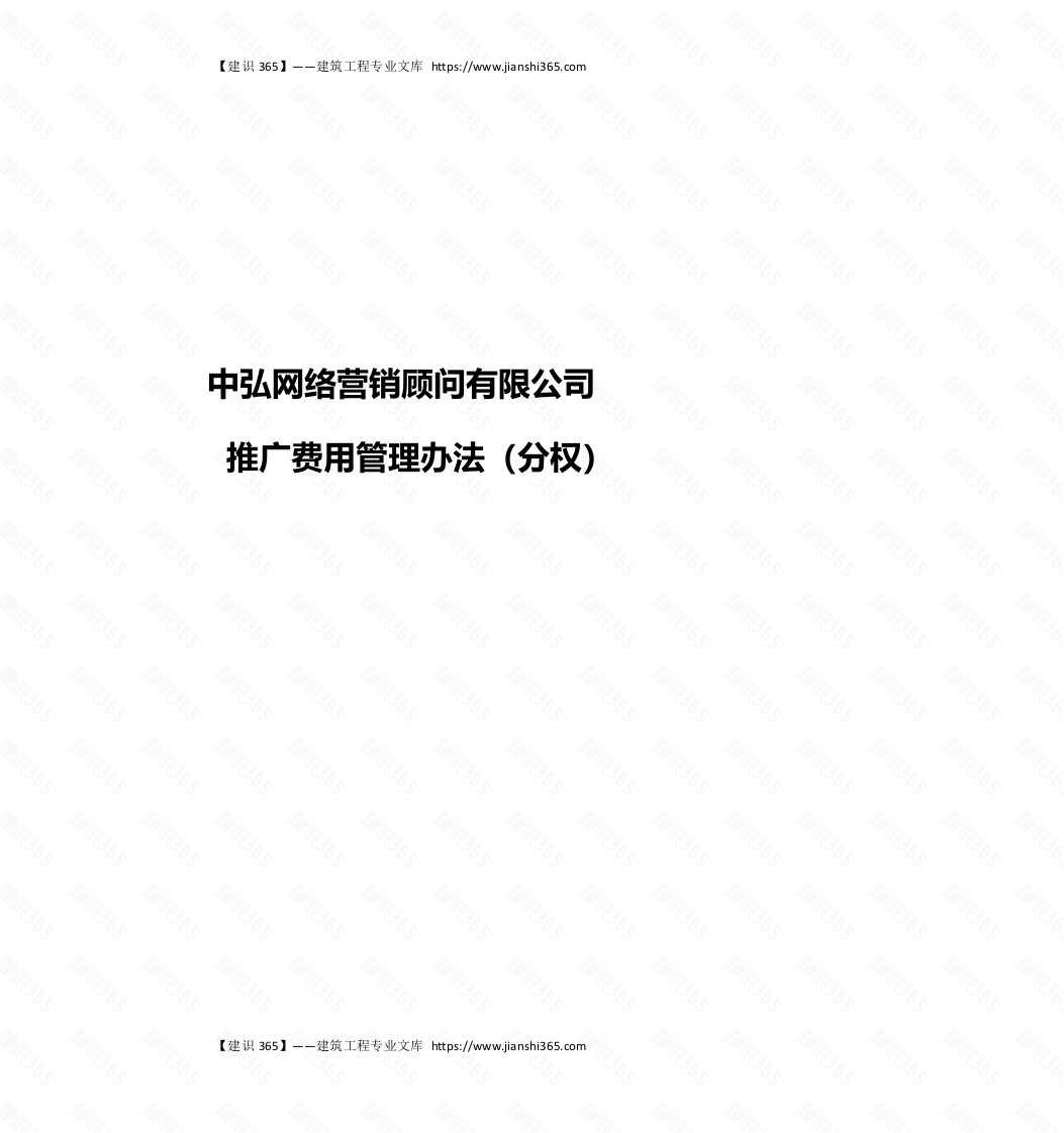【建识365】一一建筑工程专业文库htps:/www.jianshi365.com识365识365识365识36识36识36中弘网络营销顾问有限公司识36推广费用管理办法(分权)识365识365识365识365识365识365识36识365建识365建识365识365建识365建识365识365识3识365识365建识365建识365识365识365建识365只36建识365识36识36识365【建识365】-一建筑工程专业文库htps:/www.jianshi365.com【建识365】一一建筑工程专业文库https::/www..jianshi365.com规范网络营销公司营销推广费用的统筹管理,加强内控与流程化管理,提高网络营销公司费用使用效率。适用范围:本制度适用于网络营销公司的各下属大区。三、职责:网络营销公司销售中心负责本规范的制定、修改、解释,检查执行情况,各下属大区负责具体实施。四、主要内容:4.1营销推广费用的界定:1)费用的定义:营销推广费用指为了分权产品销售而开展的展示措施、广告宣传、活动组织等行为,以及与营销相关的售后服务、维护保养、促销等行为,所发生的一切费用。2)费用的分类:依据费用与产品的关系,细分了详细的科目,具体参照《预算管理办法》,里《销售中心管理费用与营销推广费用预算科目说明》的科目要求。4.2费用目标管理:【建识365】一-建筑工程专业文库htps:/www..jianshi365.com