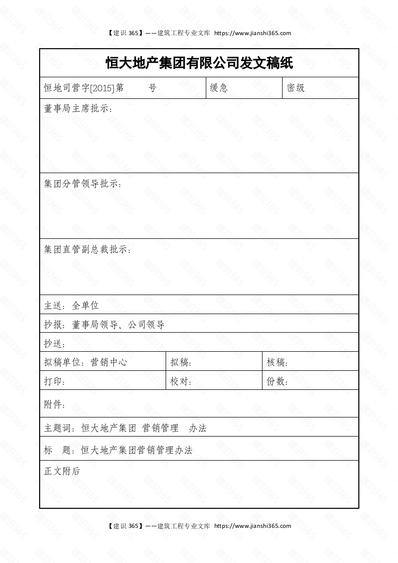 【建识365】一一建筑工程专业文库htps:/www..jianshi365.com恒大地产集团有限公司发文稿纸恒地司营字[2015]第号缓急密级董事局主席批示:集团分管领导批示:集团直管副总裁批示:主送:全单位抄报:董事局领导、公司领导抄送:拟稿单位:营销中心拟稿:核稿:打印:校对:份数:附件:主题词:恒大地产集团营销管理办法标题:恒大地产集团营销管理办法正文附后【建识365】一一建筑工程专业文库htps:/www..jianshi365.com【建识365】一-一建筑工程专业文库htps:/www..jianshi365.com恒大地产集团营销管理办法第一章营销策划管理第一条所有项目销售代理公司的确定、变更或自建销售团队,报集团营销直管副总裁审批后执行。第二条项目首次选定、续签、更换全案广告代理公司,报地区公司董事长(或主持工作一把手)审批执行,报营销中心备案。第三条项目开工前,地区公司营销部会同销售代理公司、总工室、工程部及工程技术部共同制定新销售中心、样板房方案,报集团营销直管副总裁审批。非标准销售中心的平面布置方案、在售项目各物业类型新增样板房方案,报集团营销直管副总裁审批。第四条新项目模型制作、D影视宣传片制作、销售围蔽及看房通道包装方案、开盘解筹活动、户外广告、外展点及单次10万元以上规模的巡展等,报集团营销直管副总裁审批。第五条地区公司在开盘前3个月内,完成各阶段营销策划方案,报集团营销直管副总裁审批。营销中心组织召开不少于4次新项目开盘前营销工作会议,检查监督地区公司每阶段的营销执行情况。第六条新项目具备以下开放条件后,方可宣传及开盘:1、销售中心、样板房装修完成,展示配置齐全;2、会所、商业街等配套达到展示条件:3、中心花园园林及销售区域周边园林环境完工;4、入口广场、外部道路及导视系统完成;5、现场按集团标准展示所有项目卖点展板,达到热烈缤纷的环境6、进入项目主干道展示性佳,道路平整,可顺利通车。第七条项目开盘前营销准备工作及现场具备开放条件后,经营销中心、管理及监察中心督查小组检查合格,地区公司上报《开盘媒体排期及审批表》,报集团营销直管副总裁审批后,方可对外集中式宣传推广。第八条地区公司营销宣传推广类的报纸、网络、框架、电台四类媒体年度合作折扣方案的立项,由地区公司董事长(或主持工作一把手)审批后,报集团营销直管副总裁审批执行。【建识365】-一一建筑工程专业文库htps:/www..jianshi365.com