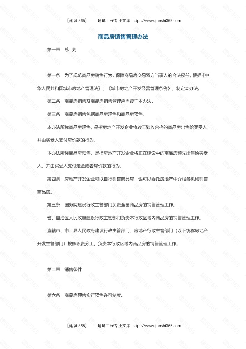 【建识365】一建筑工程专业文库https:/www,jianshi365.com商品房销售管理办法第一章总则第一条为了规范商品房销售行为,保障商品房交易双方当事人的合法权益,根据《中华人民共和国城沛房地产管理法》、《城市房地产开发经营管理条例》,制定本办法。第二条商品房销售及商品房销售管理应当遵守本办法。第三条商品房销售包括商品房现售和商品房预售。本办法所称商品房现售,是指房地产开发企业将竣工验收合格的商品房出售给买受人,并由买受人支付房价款的行为。本办法所称商品房预售,是指房地产开发企业将正在建设中的商品房预先出售给买受人,并由买受人支付定金或者房价款的行为。第四条房地产开发企业可以自行销售商品房,也可以委托房地产中介服务机构销售商品房。第五条国务院建设行政主管部门负责全国商品房的销售管理工作。省、自治区人民政府建设行政主管部门负责本行政区域内商品房的销售管理工作。直辖市、市、县人民政府建设行政主管部门、房地产行政主管部门(以下统称房地产开发主管部门)按照职责分工,负责本行政区域内商品房的销售管理工作。第二章销售条件第六条商品房预售实行预售许可制度。【建识365】一建筑工程专业文库htps:/www,.jianshi365.com【建识365】一建筑工程专业文库htps/www,.jianshi365.com商品房预售条件及商品房预售许可证明的办理程序,按照《城市房地产开发经营管理条例》和《城市商品房预售管理办法》的有关规定执行。第七条商品房现售,应当符合以下条件:(一)现售商品房的房地产开发企业应当具有企业法人营业执照和房地产开发企业资(二)取得土地使用权证书或者使用土地的批准文件:(三)持有建设工程规划许可证和施工许可证;(四)已通过竣工验收;(五)拆迁安置已经落实:(六)供水、供电、供热、燃气、通讯等配套基础设施具备交付使用条件,其他配套基础设施和公共设施具备交付使用条件或者已确定施工进度和交付日期:(七)物业管理方案已经落实。第八条房地产开发企业应当在商品房现售前将房地产开发项目手册及符合商品房现售条件的有关证明文件报送房地产开发主管部门备案。第九条房地产开发企业销售设有抵押权的商品房,其抵押权的处理按照《中华人民共和国担保法》、《城沛房地产抵押管理办法》的有关规定执行。第十条房地产开发企业不得在未解除商品房买卖合同前,将作为合同标的物的商品房再行销售给他人。第十一条房地产开发企业不得采取返本销售或者变相返本销售的方式销售商品房。房地产开发企业不得采取售后包租或者变相售后包租的方式销售未竣工商品房。第十二条商品住宅按套销售,不得分割拆零销售。【建识365】一建筑工程专业文库htps:/ww,jianshi365.com