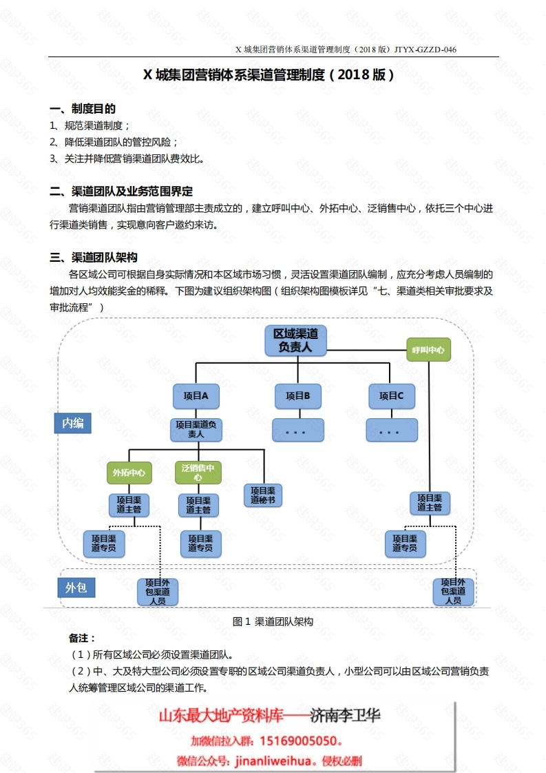 X城集团营销体系渠道管理制度(2018版)TYX-GZZD-046X城集团营销体系渠道管理制度(2018版)一、制度目的1、规范渠道制度;2、降低渠道团队的管控风险;3、关注并降低营销渠道团队费效比。二、渠道团队及业务范围界定营销渠道团队指由营销管理部主责成立的,建立呼叫中心、外拓中心、泛销售中心,依托三个中心进行渠道类销售,实现意向客户邀约来访。三、渠道团队架构各区域公司可根据自身实际情况和本区域市场习惯,灵活设置渠道团队编制,应充分考虑人员编制的增加对人均效能奖金的稀释。下图为建议组织架构图(组织架构图模板详见”七、渠道类相关审批要求及审批流程”)区域渠道负责人项目A项目B项目C内编项目渠道负外拓中心泛销售中项目渠项目渠道秘书项目渠道主管道主管道主管项目渠道专员道专员道专员外包项目外项目外包渠道员人员图1渠道团队架构备注:(1)所有区域公司必须设置渠道团队。(2)中、大及特大型公司必须设置专职的区域公司渠道负责人,小型公司可以由区域公司营销负责人统筹管理区域公司的渠道工作。山东最大地产资料库一济南李卫华加微信拉入群:15169005050。微信公众号:jinanliweihua。侵权必删X城集团营销体系渠道管理制度(2018版)TYX-GZZD-046(3)内编渠道人员,仅渠道主管以上(不含渠道主管)及渠道秘书计入人均效能,其他人员均不计入人均效能。(4)项目渠道负责人采用双向汇报方式,在专业职能条线向区域公司渠道负责人汇报,在项目渠道日常事务的管理工作上向项目营销负责人汇报。职位人数建议编制主要职责区域公司渠道负责人据定岗定编规定执行公司正式编制统筹区域公司道工作,主导完成营销管理部下达的各项指标和任务项阻渠道负责人据定岗定编规定执行公司正式编制统诺项目渠道工作,主导完成营销管理部下达的洛项指标和任务项目道秘书据定岗定编规定执行公司正式编制渠道人员考勤、道人员招幕、道制度建立、渠道数据统计分析等多名公司正式编制管理外拓中心、呼和叫中心等的人员及业绩产出项目渠道专员据实际工作灵活控制公司正式编制派单拦截、电话CAL客企业拓展跟进等具体工作项目外包渠道人员据实际工作灵活控制外包渠道(如:小密蜂)派单拦哉、电话CAL山客、企业拓展跟进等具体工作四、渠道业务模块定义1、呼叫中心:通过集中性的电话外呼方式,进行项目价值点、销售信息的及时传递,邀约意向客户到访。其人员主要由项目通过各种招聘通路(包括但不限于网络、校园招聘、CALL客外包公司等)进行招2、外拓中心:通过竞品拦截、定向派单拓客、巡展拓客等形式,进行项目价值点、销售信息的及时传递并邀约意向客户到访。其人员主要由项目通过各种招聘通路(包括但不限于网络、校园招聘、拓客外包公司等)进行招募。3、泛销售中心:泛销售人员或机构通常指公司内部员工(除营销体系)、全民营销经纪人、中介公司、渠道总代公司。项目与上述几类渠道通道进行客户导入合作,并按照单套结算佣金的方式进行佣金支付。泛销售管理制度及要求,详见《X城集团营销体系泛销售渠道管理制度(2017试行版)》(或最新版)。五、渠道人员岗位说明及职责1、区域公司渠道负责人(1)搭建并完善渠道体系,制定渠道管理、运作、考核、评估等标准化内容;负责渠道管理团队的管理、评估,帮助渠道管理团队制定并实施职业生涯的成长规划。(2)根据指标分解,负责制定渠道销售方案及政策,指导渠道团队完成计划销售任务及达成各项考核指标。(3)负责开发、组织多种渠道营销通路、整合内外部渠道资源、开拓创新渠道运作方式,负责向外部渠道公司传达最新的销售政策和市场动态信息,管理维护中介公司、全民营销经纪人、渠道总代公司等所辖渠道的合作关系。2/10