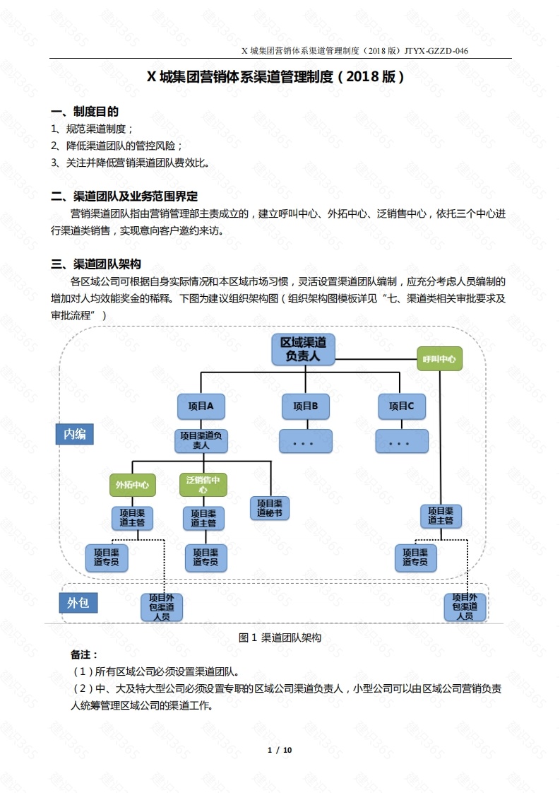 X城集团营销体系渠道管理制度(2018版)TYX-GZZD-046X城集团营销体系渠道管理制度(2018版)一、制度目的1、规范渠道制度;2、降低渠道团队的管控风险;3、关注并降低营销渠道团队费效比。二、渠道团队及业务范围界定营销渠道团队指由营销管理部主责成立的,建立呼叫中心、外拓中心、泛销售中心,依托三个中心进行渠道类销售,实现意向客户邀约来访。三、渠道团队架构各区域公司可根据自身实际情况和本区域市场习惯,灵活设置渠道团队编制,应充分考虑人员编制的增加对人均效能奖金的稀释。下图为建议组织架构图(组织架构图模板详见”七、渠道类相关审批要求及审批流程”)区域渠道负责人项目A项目B项目C内编项目渠道负外拓中心泛销售中项目渠项目渠道秘书项目渠道主管道主管道主管项目渠道专员道专员道专员外包项目外项目外包渠道员人员图1渠道团队架构备注:(1)所有区域公司必须设置渠道团队。(2)中、大及特大型公司必须设置专职的区域公司渠道负责人,小型公司可以由区域公司营销负责人统筹管理区域公司的渠道工作。1/10X城集团营销体系渠道管理制度(2018版)TYX-GZZD-046(3)内编渠道人员,仅渠道主管以上(不含渠道主管)及渠道秘书计入人均效能,其他人员均不计入人均效能。(4)项目渠道负责人采用双向汇报方式,在专业职能条线向区域公司渠道负责人汇报,在项目渠道日常事务的管理工作上向项目营销负责人汇报。职位人数建议编制主要职责区域公司渠道负责人据定岗定编规定执行公司正式编制统筹区域公司道工作,主导完成营销管理部下达的各项指标和任务项阻渠道负责人据定岗定编规定执行公司正式编制统诺项目渠道工作,主导完成营销管理部下达的洛项指标和任务项目道秘书据定岗定编规定执行公司正式编制渠道人员考勤、道人员招幕、道制度建立、渠道数据统计分析等多名公司正式编制管理外拓中心、呼和叫中心等的人员及业绩产出项目渠道专员据实际工作灵活控制公司正式编制派单拦截、电话CAL客企业拓展跟进等具体工作项目外包渠道人员据实际工作灵活控制外包渠道(如:小密蜂)派单拦哉、电话CAL山客、企业拓展跟进等具体工作四、渠道业务模块定义1、呼叫中心:通过集中性的电话外呼方式,进行项目价值点、销售信息的及时传递,邀约意向客户到访。其人员主要由项目通过各种招聘通路(包括但不限于网络、校园招聘、CALL客外包公司等)进行招2、外拓中心:通过竞品拦截、定向派单拓客、巡展拓客等形式,进行项目价值点、销售信息的及时传递并邀约意向客户到访。其人员主要由项目通过各种招聘通路(包括但不限于网络、校园招聘、拓客外包公司等)进行招募。3、泛销售中心:泛销售人员或机构通常指公司内部员工(除营销体系)、全民营销经纪人、中介公司、渠道总代公司。项目与上述几类渠道通道进行客户导入合作,并按照单套结算佣金的方式进行佣金支付。泛销售管理制度及要求,详见《X城集团营销体系泛销售渠道管理制度(2017试行版)》(或最新版)。五、渠道人员岗位说明及职责1、区域公司渠道负责人(1)搭建并完善渠道体系,制定渠道管理、运作、考核、评估等标准化内容;负责渠道管理团队的管理、评估,帮助渠道管理团队制定并实施职业生涯的成长规划。(2)根据指标分解,负责制定渠道销售方案及政策,指导渠道团队完成计划销售任务及达成各项考核指标。(3)负责开发、组织多种渠道营销通路、整合内外部渠道资源、开拓创新渠道运作方式,负责向外部渠道公司传达最新的销售政策和市场动态信息,管理维护中介公司、全民营销经纪人、渠道总代公司等所辖渠道的合作关系。2/10