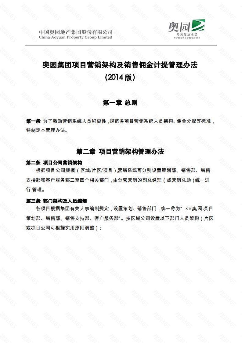 奥园中国奥园地产集团股份有限公司构筑健康生活China Aoyuan Property Group Limited奥园集团项目营销架构及销售佣金计提管理办法(2014版)第一章总则第一条为了激励营销系统人员积极性,规范各项目营销系统人员架构、佣金分配等标准,特制定本管理办法。第二章项目营销架构管理办法第二条项目公司营销架构根据项目公司规模(区域/片区/项目),营销系统可分别设置策划部、销售部、销售支持部和客户服务部三至四个相关部门,由分管营销的副总经理(或营销总助)统一进行管理。第三条部门架构及人员编制各项目根据集团有关人事编制规定,设置策划、销售部门,统一称为“××奥园项目策划部、销售部、销售支持部、客户服务部”。按区域公司设置以下部门人员架构(片区或项目公司可根据实用原则调整):中国奥园地产集团股份有限公司奥园构筑健康生活China Aoyuan Property Group Limited(或营销总助)策划部经理销售支持部经理客服部经理(经理)策划经理销售经理销售支持主管客服主管策划主管销售主管销售支持专员助理客服专员、助理策划专员、助理部门人员架构说明:>区域公司可按照合理调配资源原则,精简人员编制,根据实际情况设立策划部、销售部、销售支持部和客户服务部;片区公司可酌情考虑将销售支持部并入客户服务部;按集团标准定为小盘的项目,策划、销售、客户服务应合并为一个部门制定架构方案。>以上对应为单个项目的人员编制原则上单个项目自建销售团队的人员控制在18人以内(其中策划部3人、销售部12人、客户服务部含销售支持3人6策划部主要负责项目的品牌管理与维护、负面新闻的监测、跟踪、处理与汇报、市场调研、营销策划、产品定位定价、宣传推广等工作;销售部主要负责项目的销售方案编制、目标实施和销售管理等工作;销售支持部主要负责项目的销控、签约、回款等销售业务工作:客户服务部主要负责项目的办证、客户售后服务、纠纷处理、客户回访及客户维护等各项客户服务工作。其它与工程对接、物业管理、法务等人员均不列入营销架构内、不参与提佣。第四条其他规定1、项目公司营销管理架构和准则,每年年初由项目公司提交集团人事考评中心人力
