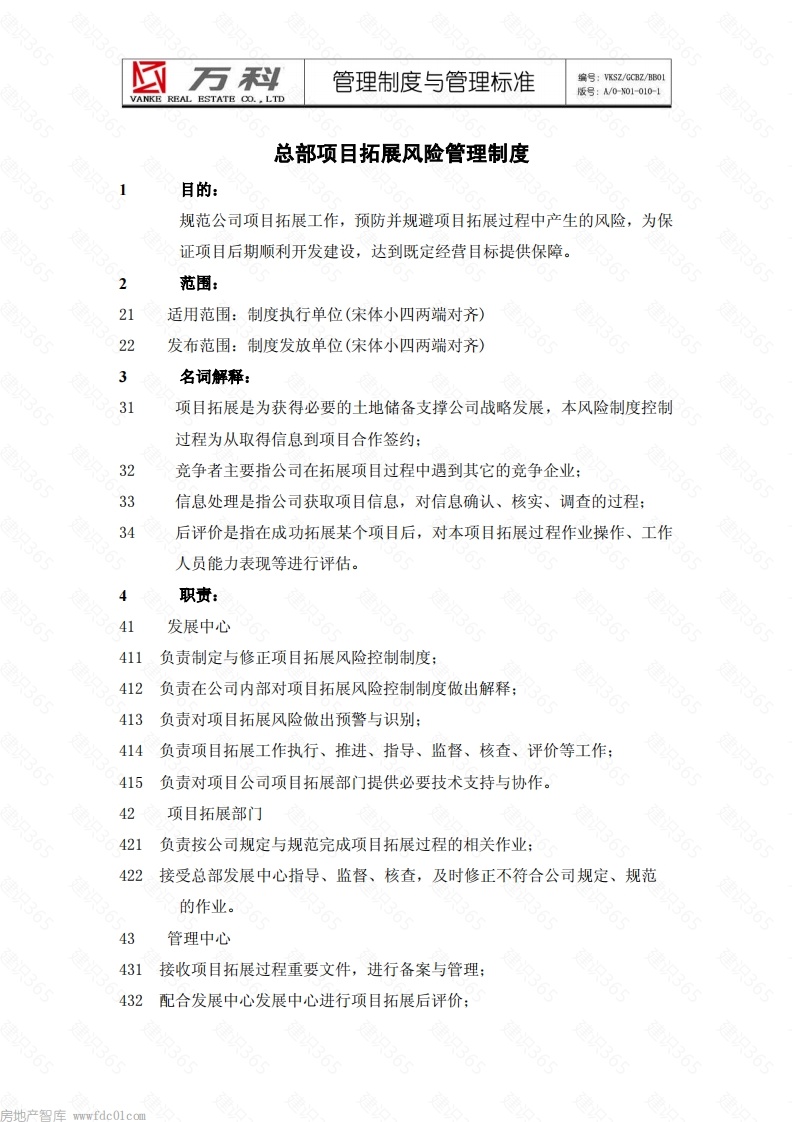 管理制度与管理标准VANKE REAL ESTATE CO..LTD总部项目拓展风险管理制度目的:规范公司项目拓展工作,预防并规避项目拓展过程中产生的风险,为保证项目后期顺利开发建设,达到既定经营目标提供保障。范围:21适用范围:制度执行单位(宋体小四两端对齐)22发布范围:制度发放单位(宋体小四两端对齐)3名词解释:31项目拓展是为获得必要的土地储备支撑公司战略发展,本风险制度控制过程为从取得信息到项目合作签约:32竞争者主要指公司在拓展项目过程中遇到其它的竞争企业:33信息处理是指公司获取项目信息,对信息确认、核实、调查的过程:34后评价是指在成功拓展某个项目后,对本项目拓展过程作业操作、工作人员能力表现等进行评估。4职责:41发展中心411负责制定与修正项目拓展风险控制制度:412负责在公司内部对项目拓展风险控制制度做出解释:413负责对项目拓展风险做出预警与识别:414负责项目拓展工作执行、推进、指导、监督、核查、评价等工作:415负责对项目公司项目拓展部门提供必要技术支持与协作。42项目拓展部门421负责按公司规定与规范完成项目拓展过程的相关作业:422接受总部发展中心指导、监督、核查,及时修正不符合公司规定、规范的作业。43管理中心431接收项目拓展过程重要文件,进行备案与管理:432配合发展中心发展中心进行项目拓展后评价:房地产智库wwwfdc01com☒管理制度与管理标准VANKE REAL ESTATE CO..LTD432建立完善公司监督、检举制度与机制。44法律部441规范项目拓展过程中的法律文本;442建立完善法律合约审批、核查制度。45财务部441配合项目拓展工作过程中融资计划与方案制定:441配合项目拓展过程中对合作方企业财务审查。5作业内容:51外部环境风险防范511政策风险防范5111发展中心每季度完成房地产宏观政策分析报告:5112项目责任人要针对项目涉及房地产国家政策及地方实施细则、行业管制情况等前期工作进行调查分析:作为项目分析材料组成部分:5113合约拟定中,将与合作方约定前期工作责任与分工,写入合作协议或相关法律合约:512融资风险防范5121项目责任人对当期地方资本市场融资方法、融资条件、融资成本进行调查分析5121项目责任人根据调查结合公司财务计划制定融资方案及预案,做为提交决策委员会议文件组成部门之一:513市场风险防范5131发展中心市场研究部门每季度编写战略重点城市市场报告,作投资潜力5132项目所在地为非战略重点城市,项目工作小组人员应在项目所在城市考查7天以上,并完成城市及区域市场投资潜力分析报告。514竞争风险防范5141项目责任人组织调查竞争手企业背景、合作条件、与合作方管理者“利害”关系;房地产智库wwwfdc01coml