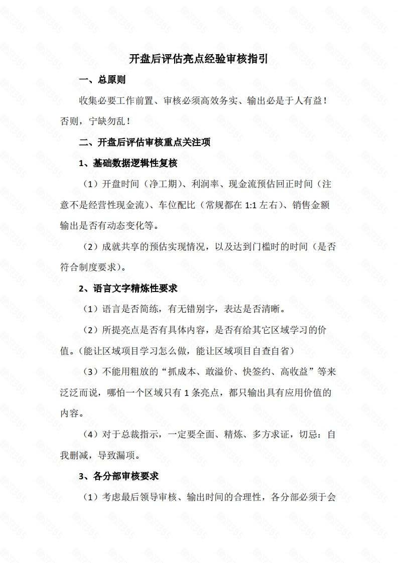 开盘后评估亮点经验审核指引一、总原则收集必要工作前置、审核必须高效务实、输出必是于人有益!否则,宁缺勿乱!二、开盘后评估审核重点关注项1、基础数据逻辑性复核(1)开盘时间(净工期)、利润率、现金流预估回正时间(注意不是经营性现金流)、车位配比(常规都在1:1左右)、销售金额输出是否有动态变化等。(2)成就共享的预估实现情况,以及达到门槛时的时间(是否符合制度要求)。2、语言文字精炼性要求(1)语言是否简练,有无错别字,表达是否清晰。(2)所提亮点是否有具体内容,是否有给其它区域学习的价值。(能让区域项目学习怎么做,能让区域项目自查自省)(3)不能用粗放的“抓成本、敢溢价、快签约、高收益”等来泛泛而说,哪怕一个区域只有1条亮点,都只输出具有应用价值的内容。(4)对于总裁指示,一定要全面、精炼、多方求证,切忌:自我删减,导致漏项。3、各分部审核要求(1)考虑最后领导审核、输出时间的合理性,各分部必须于会议前1天完成初稿审核(有总裁指示的后添加即可)。(2)会议纪要最迟须于会议后1天提交审核,以领导要求为主,方便区域项目跟进落实。三、释例一、【x-x项目】(一)项目开盘概况1、基本信息:该项目总占地XX亩,地价XX万/亩,楼面地价XX元/m;其中一期开盘占地XX亩,容积率XX,总建筑面积约XX万平米;项目于XXXX-XX-XX正式获取,XX个月开放,XX个月开盘。车位配比XX,车位总货值占项目总利润比为XX。2、销售情况:项目总货值XX亿元,首推货值XX亿(XX套,占总货值XX%),去化XX套(其中车位XX个,双拼XX套,洋房Xx套),货值XX亿。去化率按按面积为XX%,按金额为XX%。折后均价车位XX元/个,双拼XX元/平方米,洋房XX元/平方米。3、成就双享情况:截至目前累计资金投入XX亿(含地款,其中区域同心共享投入X万),回款XX亿,预计X个月实现经营性现金流为正,预计成就共享奖金XX万,年化自有资金收益率XX%,开盘净利润率XX%,预计全周期净利润率XX%。(二)亮点与经验总结1、精准定位,蓄势蓄筹,敢于溢价(1)研发新户型:根据福州客户喜好,与市场高档产品对标,按需研发新户型;(2)全营销系统生态链:通过快速建立内场“联和代理”、外场“分销、地推、电CLL、圈层”一体的全营销系统生态链,抢夺区(3)提升客户预期:通过打造智慧社区(增加智能安防、智能