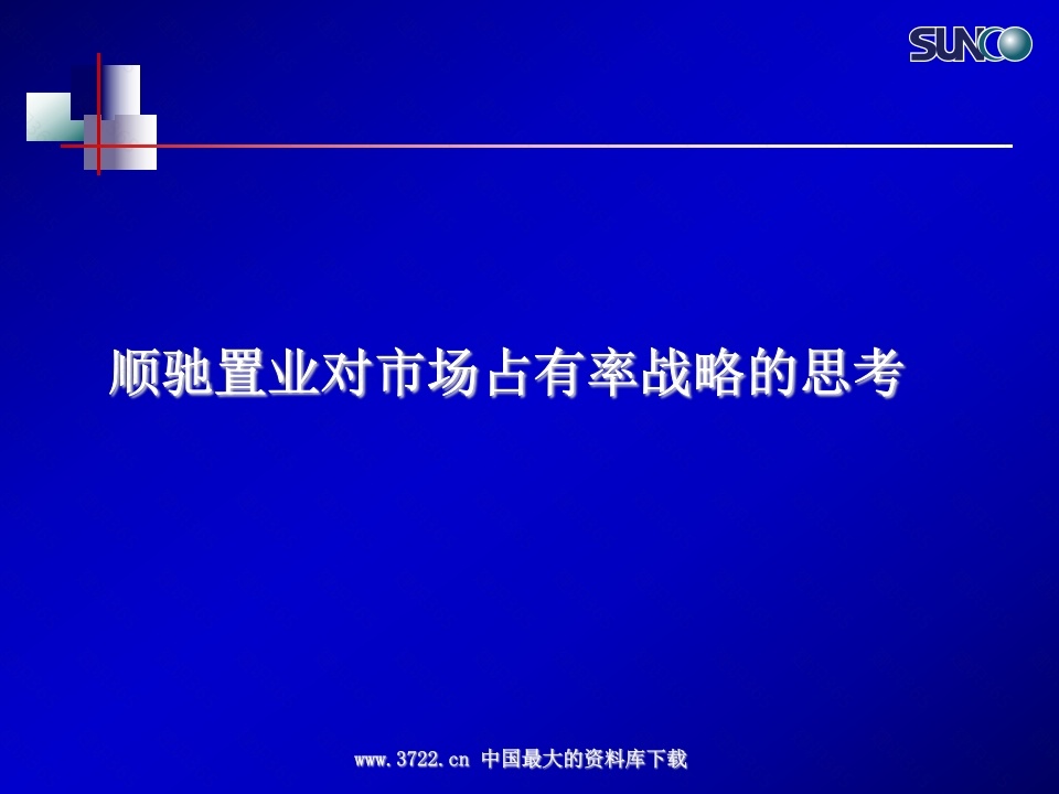 顺驰置业对市场占有率战略的思考www.3722.cn中国最大的资料库下载顺驰置业对市场占有率战略的思考现阶段战略目标二、战略执行过程中对战略的进一步理解与思考三、目前工作中的差距四、实现市场占有率战略的措施www.3722.cn中国最大的资料库下载