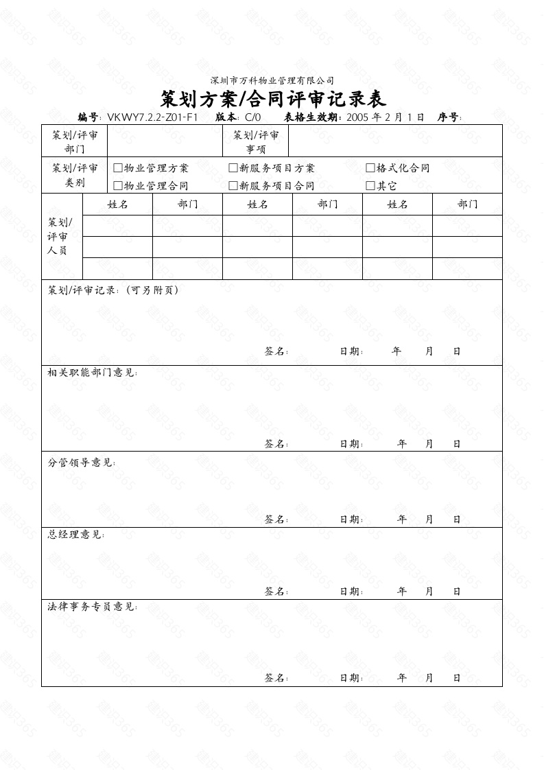 深圳市万科物业管理有限公司策划方案/合同评审记录表编号:VKWY7.2.2-Z01-F1版本:C/0表格生效期:2005年2月1日序号:策划/评审策划/评审部门事项策划/评审口格式化合同类别口物业管理合同口新服务项目合同姓名部门姓名部门姓名部门策划/评审人员策划/评审记录:(可另附页)签名:日期:年月日相关职能部门意见:签名:日期:年月日分管领导意见:签名:日期:年月日总经理意见:签名:日期:年月日法律事务专员意见:签名:年6月日