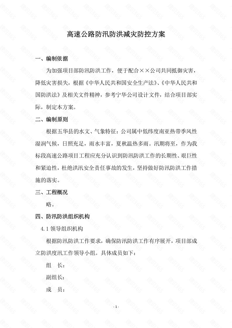 高速公路防汛防洪减灾防控方案一、编制依据为加强项目部防汛防洪工作,便于配合××公司共同抵御灾害,降低灾害损失,根据《中华人民共和国安全生产法》、《中华人民共和国防洪法》及相关文件精神,参考宁华公司设计文件,结合项目部实际,制定本方案。二、编制原则根据五华县的水文、气象特征:公司属中低纬度南亚热带季风性湿润气候,日照充足,雨水丰富,夏秋温热多雨。汛期将至,作为我标段高速公路项目工程应充分认识到防汛防洪工作的长期性、艰巨性和紧迫性,杜绝洪汛安全责任事故的发生,坚持做好防汛防洪工作措施的落实。三、工程概况略。四、防汛防洪组织机构4.1领导组织机构根据防汛防洪工作要求,确保防汛防洪工作有序展开,项目部成立防洪度汛工作领导小组。具体成员如下:副组长:成员:4.2领导组织责任(1)认真贯彻、传达宁华公司在汛期各种指令、文件要求。(2)负责配合当地政府有关部门做好防汛防洪工作。(3)及时收集汛期各种安全动态。(4)负责防汛抢险队伍的组织及抢险物资的准备。(5)负责恢复和善后处理,组织恢复生产,总结经理,完善防汛防护工作措施。五、汛前保障措施5.1一般保障措施(1)根据职责,各部门对所管区域的具体情况备好充足抢险物资及救生器材,物资部门对储备的物资数量、名称、存放地点、联系人、联系电话进行检查核对。(2)配合好所在地区组织好抢险队伍,对重要设施设备做到有专人负责。(3)制定相应应急预安。5.2专项保障措施1、路基工程汛前保障措施(1)疏通开挖路基沿线所有排水沟,保障排水通畅。(2)在涵洞入口,被路基阻断的排水沟处埋设涵管。(3)遇中雨、大雨、暴雨天气,项目工程部,安全部组织人员进行全线巡查,发现问题立即上报,及时排除险情。(4)保证现场至少有一辆皮卡车,一台挖机以备抢险。