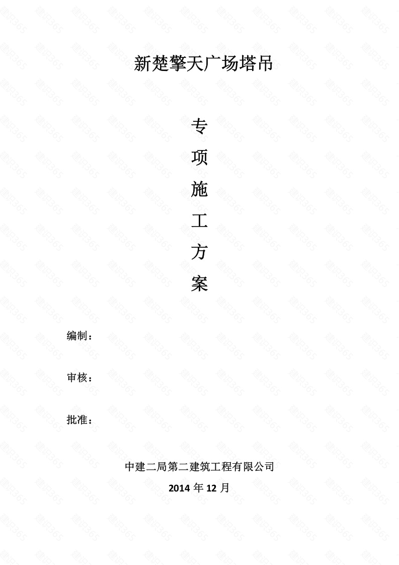 新楚擎天广场塔吊识36识365专项施工方案识365识36识365识365编制:识365建识365建识365建识365审核:识365批准:识36中建二局第二建筑工程有限公司2014年12月目录1、方案编制依据1.1编制依据..3.1塔吊布置及选型的几点要求:3.2塔吊布置及选型3.2.1塔吊布置...3.2.2塔吊的选型4.1ZSL750塔吊性能参数...5、塔吊基础.…125.1塔吊基础的施工..125.2基础预埋步骤13-15-16-6.1安装辅助吊车的选择...16-6.2塔吊安装前准19-19-6.5塔吊重量尺寸表20-6.6塔吊安装步骤.21-7、塔吊的爬升..26-7.1工况转换...26-7.2爬升前的准备工作26-7.3爬升作业人员配备..267.4爬升作业工具配备..267.5爬升系统的检查267.6寻找塔吊顶升平衡27