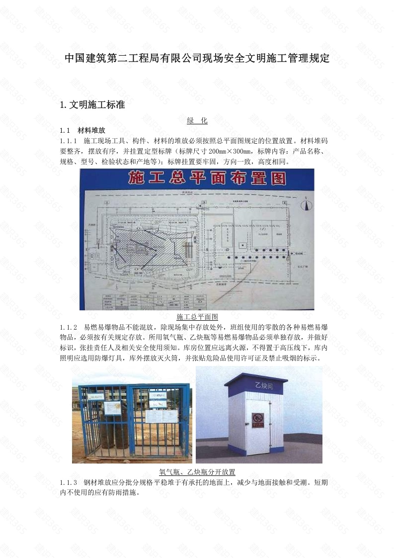 中国建筑第二工程局有限公司现场安全文明施工管理规定1.文明施工标准绿化1.1材料堆放1.1.1施工现场工具、构件、材料的堆放必须按照总平面图规定的位置放置。材料堆码要整齐,摆放有序,并挂置定型标牌(标牌尺寸200mm×300mm,标牌内容:产品名称、规格、型号、检验状态和产地等):标牌挂置要牢固,方向一致,高度相同。施工总平面布置图施工总平面图1.1.2易燃易爆物品不能混放,除现场集中存放处外,班组使用的零散的各种易燃易爆物品,必须按有关规定存放。所用氧气瓶、乙炔瓶等易燃易犀物品必须单独存放,并做好标识,张挂责任人及相关安全使用须知。库房位置应远离火源,不得置于高压线下,库内照明应选用防爆灯具,库外摆放灭火筒,并张贴危险品使用许可证及禁止吸烟的标示。氧气瓶、乙炔瓶分开放置1.1.3钢材堆放应分批分规格平稳堆于有承托的地面上,减少与地面接触和受潮。短期内不使用的应有防雨措施。钢管堆放区型材堆放区成品钢筋堆放区钢筋原材堆放区1.1.4木材堆放必须用木枋或钢管架体承托,避免受潮或倾斜。露天存放且短期内不使用的应有防雨措施。1.1.5大模板存放:大模板存放必须确保安全,堆放形式、堆放高度等需严格按照国家有关规范、标准执行,以防发生坍塌事故。识36识36识365识365