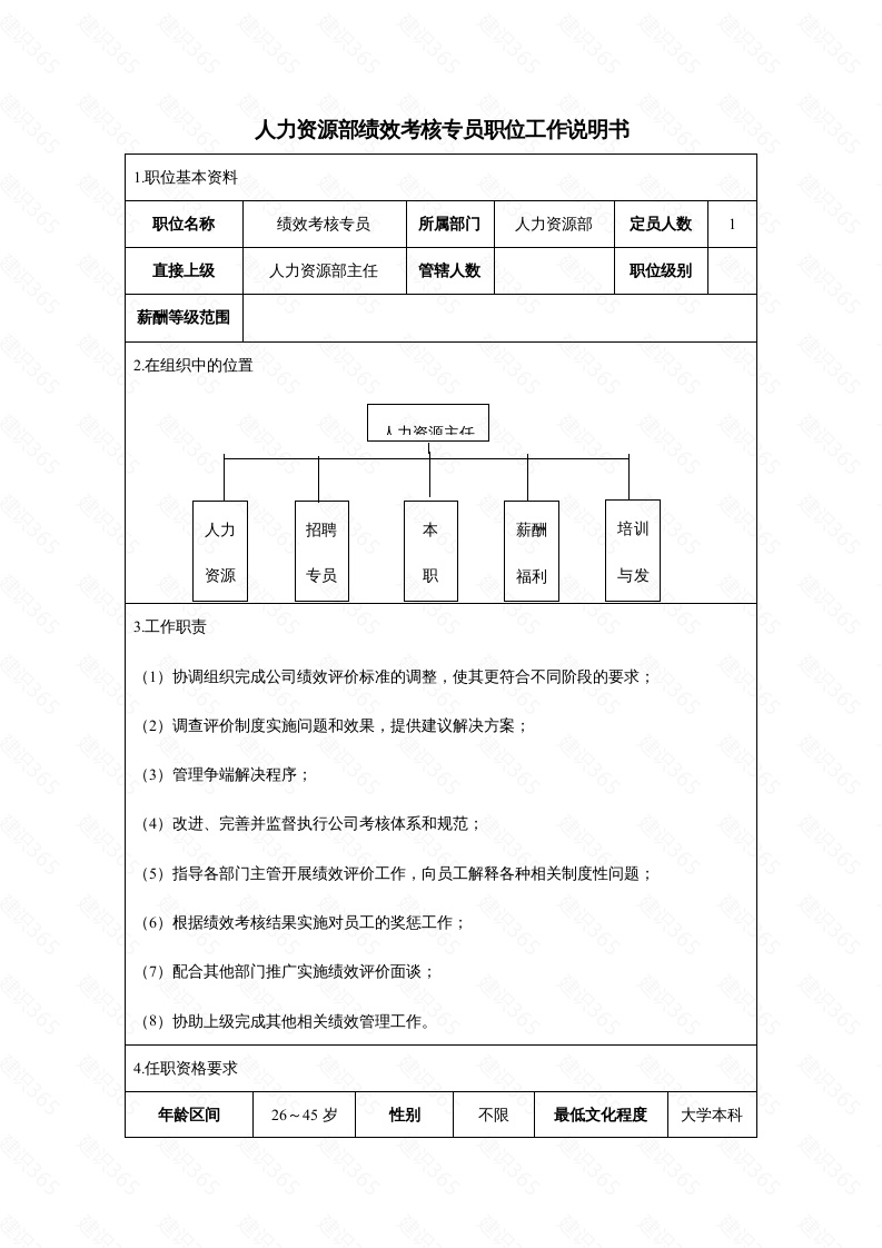 人力资源部绩效考核专员职位工作说明书1职位基本资料职位名称绩效考核专员所属部门人力资源部定员人数直接上级人力资源部主任管辖人数职位级别薪酬等级范围2.在组织中的位置人力招聘本薪酬培训资源专员职福利与发3工作职责(1)协调组织完成公司绩效评价标准的调整,使其更符合不同阶段的要求;(2)调查评价制度实施问题和效果,提供建议解决方案;(3)管理争端解决程序;(4)改进、完善并监督执行公司考核体系和规范;(5)指导各部门主管开展绩效评价工作,向员工解释各种相关制度性问题;(6)根据绩效考核结果实施对员工的奖惩工作;(7)配合其他部门推广实施绩效评价面谈;(8)协助上级完成其他相关绩效管理工作。4.任职资格要求年龄区间26~45岁性别不限最低文化程度大学本科专业要求人力资源、劳动经济、心理学、管理学等相关专业任职经验3年以上相近职位经验品德要求协作性、积极性、行动力、责任感。◆熟悉国家人事政策、法律法规;36◆熟悉各种绩效评价方法;◆熟悉绩效管理流程;◆人力资源管理理论基础扎实;能力要求识36◆熟练使用相关办公软件。◆良好的职业操守,细致、耐心、谨慎、踏实、稳重:◆强烈的敬业精神与责任感,工作原则性强;◆人际沟通、协调能力强,良好的团队合作意识。识365识365识365识365建识365建识365识365识365只365建识365