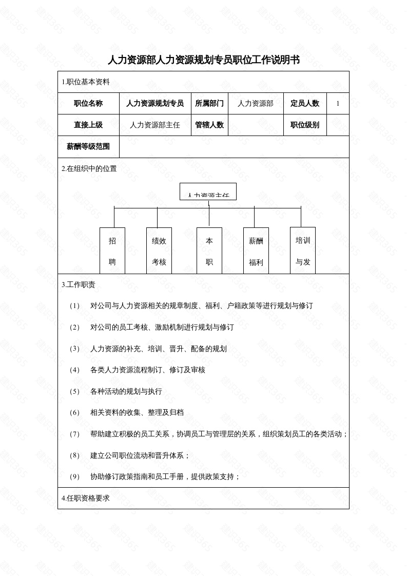 人力资源部人力资源规划专员职位工作说明书1职位基本资料职位名称人力资源规划专员所属部门人力资源部定员人数直接上级人力资源部主任管辖人数职位级别薪酬等级范围2.在组织中的位置招绩效本薪酬培训聘考核职福利与发3工作职责(1)对公司与人力资源相关的规章制度、福利、户籍政策等进行规划与修订(2)对公司的员工考核、激励机制进行规划与修订(3)人力资源的补充、培训、晋升、配备的规划(4)各类人力资源流程制订、修订及审核(5)各种活动的规划与执行(6)相关资料的收集、整理及归档(7)帮助建立积极的员工关系,协调员工与管理层的关系,组织策划员工的各类活动;(8)建立公司职位流动和晋升体系;(9)协助修订政策指南和员工手册,提供政策支持;4.任职资格要求年龄区间26~45岁性别不限最低文化程度大学本科专业要求人力资源或管理学任职经验3年以上相近职位经验品德要求协作性、积极性、行动力、责任感。有丰富的人力资源规划实际操作经验。熟练使用各种办公软件。只365能力要求文笔优秀、口头表达能力强。有极强的沟通和解决问题的能力。识36较好的个人形象气质。365识365识365识365建识365只365只365只365只365只36